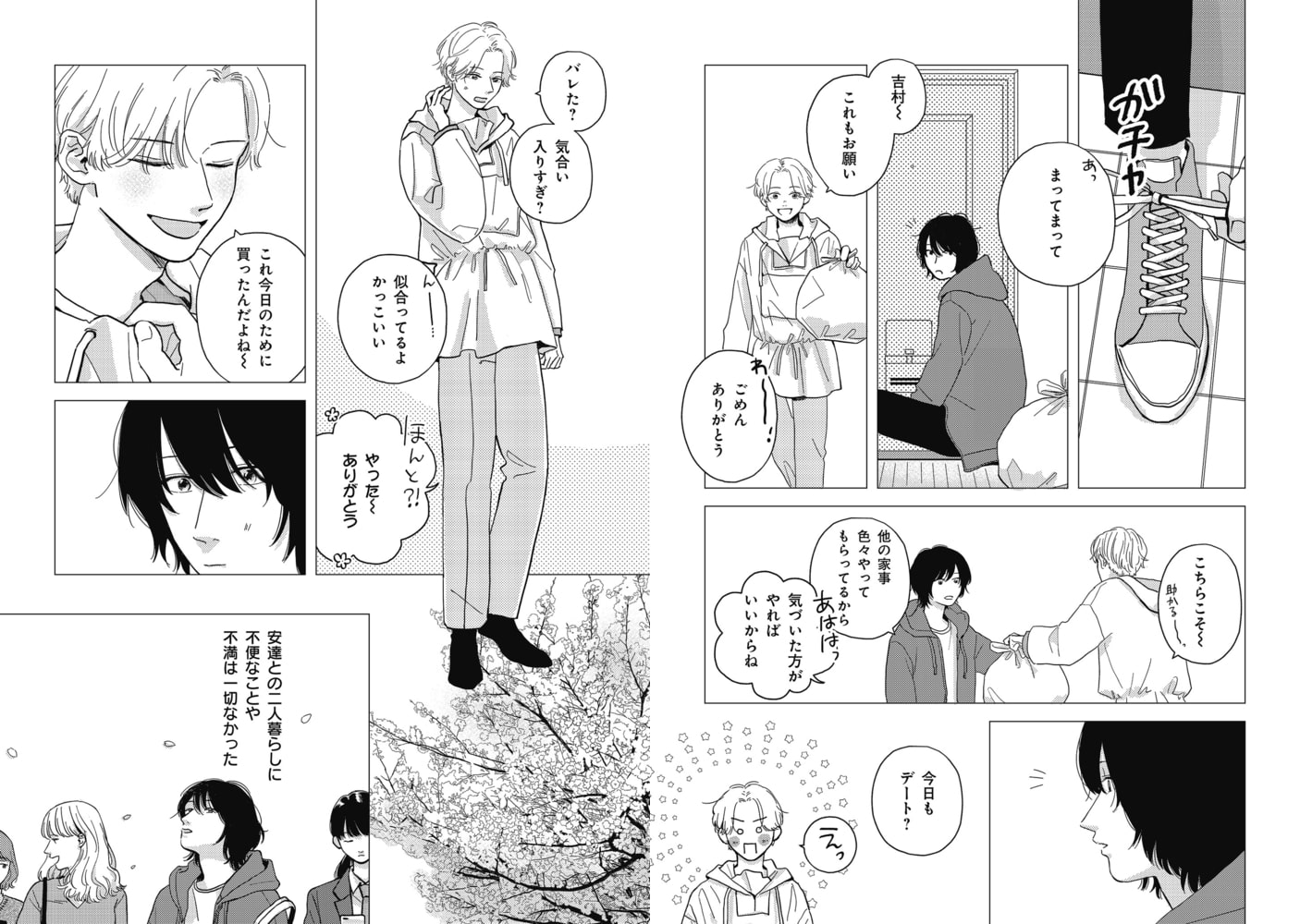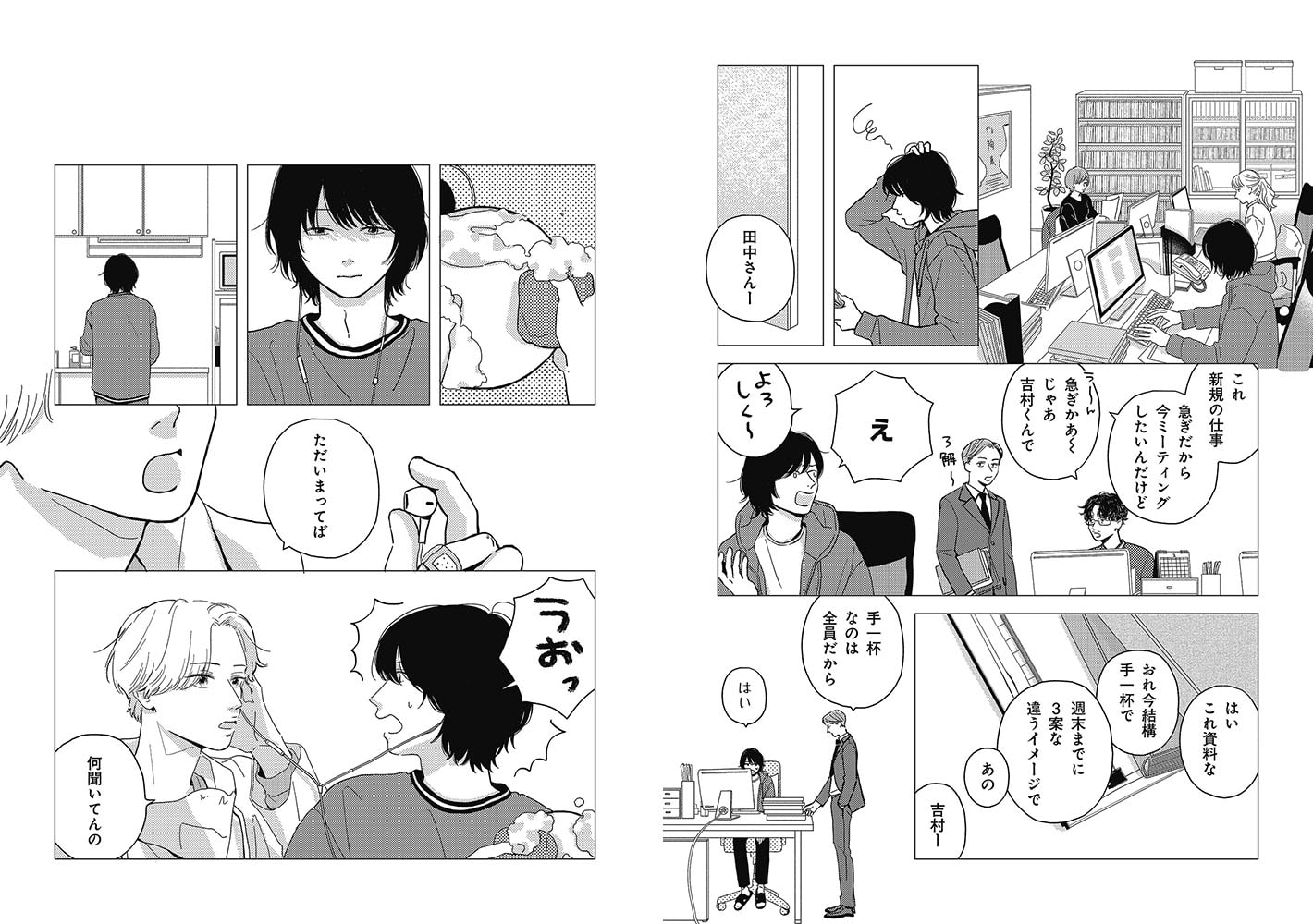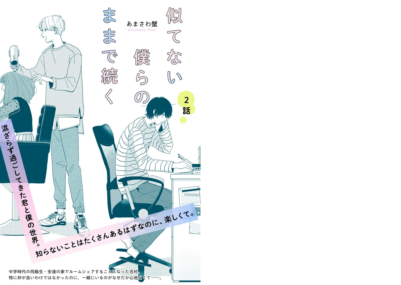 同窓会で再会したパリピな美容師の安達とデザイナーで淡白な性格の吉村。学生時代は特に関わりがなかった二人だが、終電を逃した吉村を安達が家に泊めてくれた際、案外気が合うことに気づく。安達からの誘いで二人はルームシェアを始めることになる。 ※本電子書籍は『mimosa vol.9』収録の「似てない僕らのままで続く 第二話」と同じ内容です。