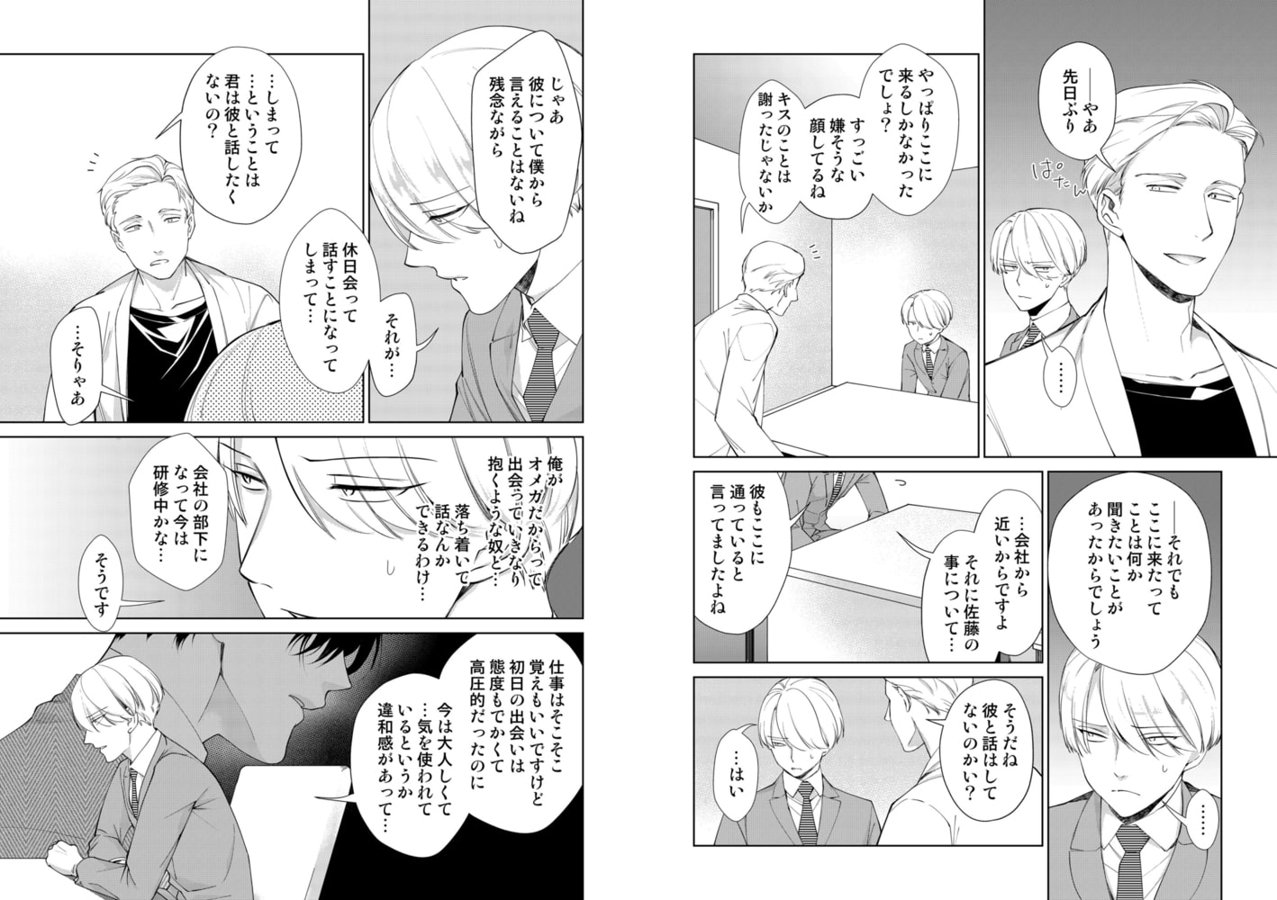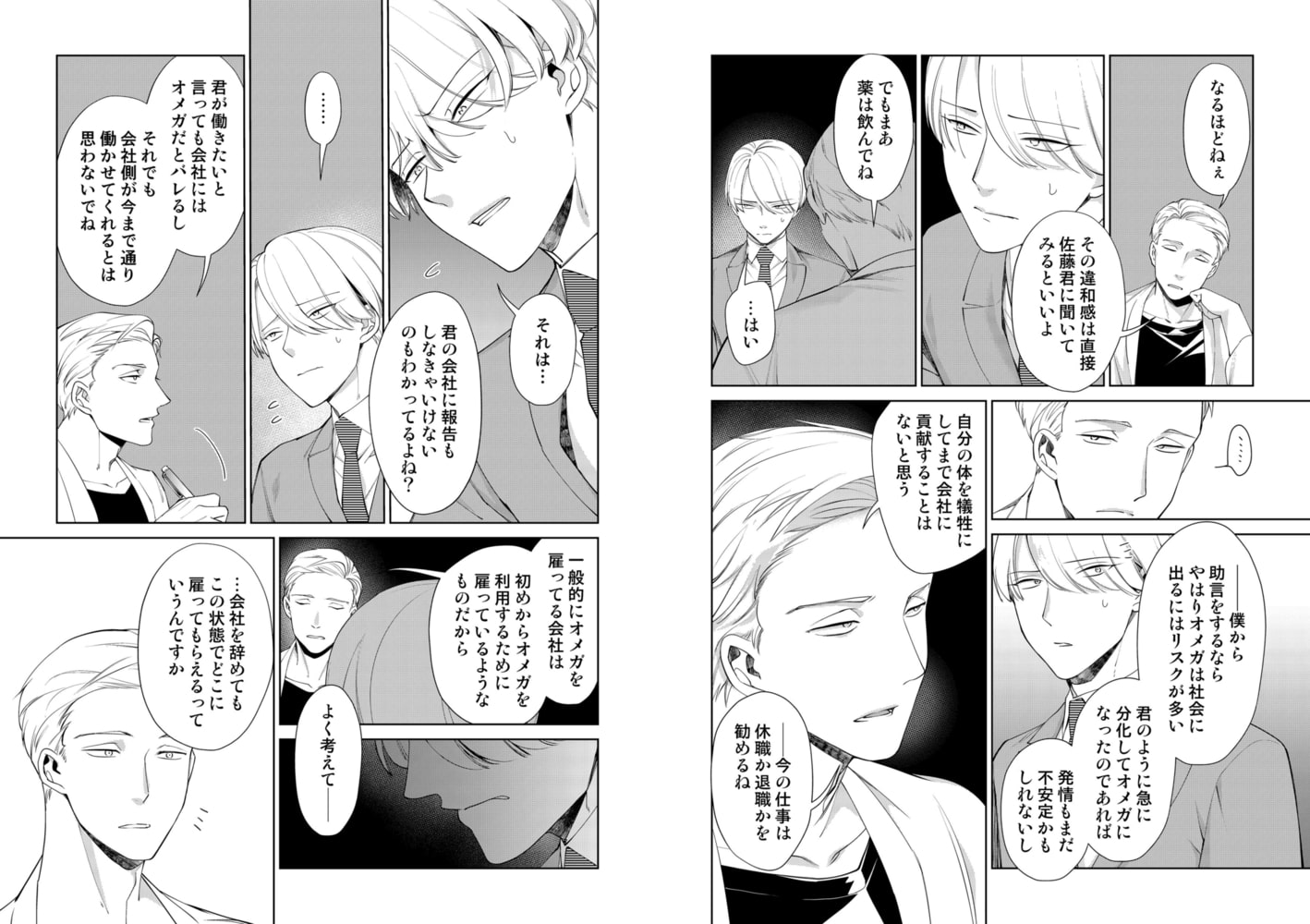 「本能で味わう快感ってヤバイでしょ?自分で腰ふってみな」志賀崎昴は会社ではエリートのトップセールスマンで、アルファでも、ベータでも、オメガでもない未分化という属性。アルファたちにも負けないほどの実力者である。ある日、新入社員でアルファの佐藤春樹と出会うと未分化であるはずの志賀崎は突然発情し、オメガに…!「いつも営業部のアルファに交ざって偉そうにしてたけど、志賀崎さんってオメガだったんだ!」「すごいフェロモンだ、犯してくださいって誘ってるみたいだな!」志賀崎は、職場で見境ない同僚のアルファたちに襲われていく…。