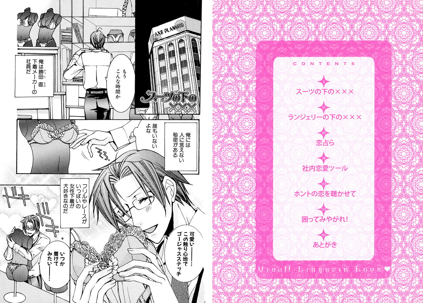 下着メーカーで働く勝田 直には、人に言えない秘密がある。実は、フリルやレースがいっぱいの女性下着が、大大大好きなのだ! 我慢できずに夜中に社内でブラジャーを着けたところを、よりにもよってデザイナーの桜井に見つかってしまう。慌てる直に、バレされたくなかったら下も着けてみろと、桜井はちっちゃなショーツをはかせてくるが、当然アソコがはみ出てしまい──!? 超ドSデザイナーの言葉責めが炸裂☆ イキすぎランジェリーラブv
