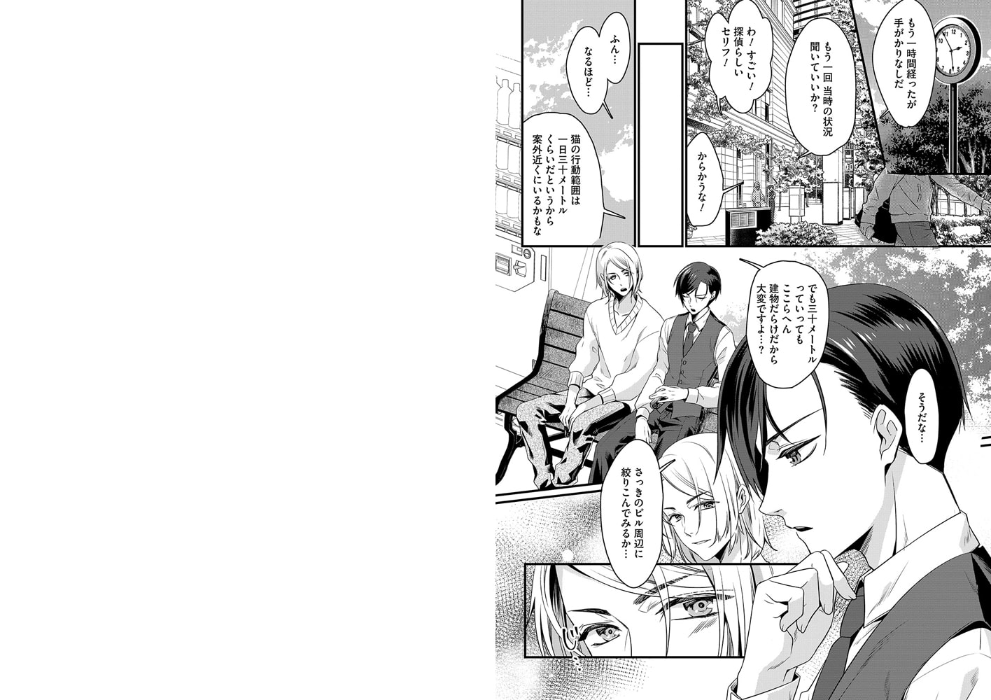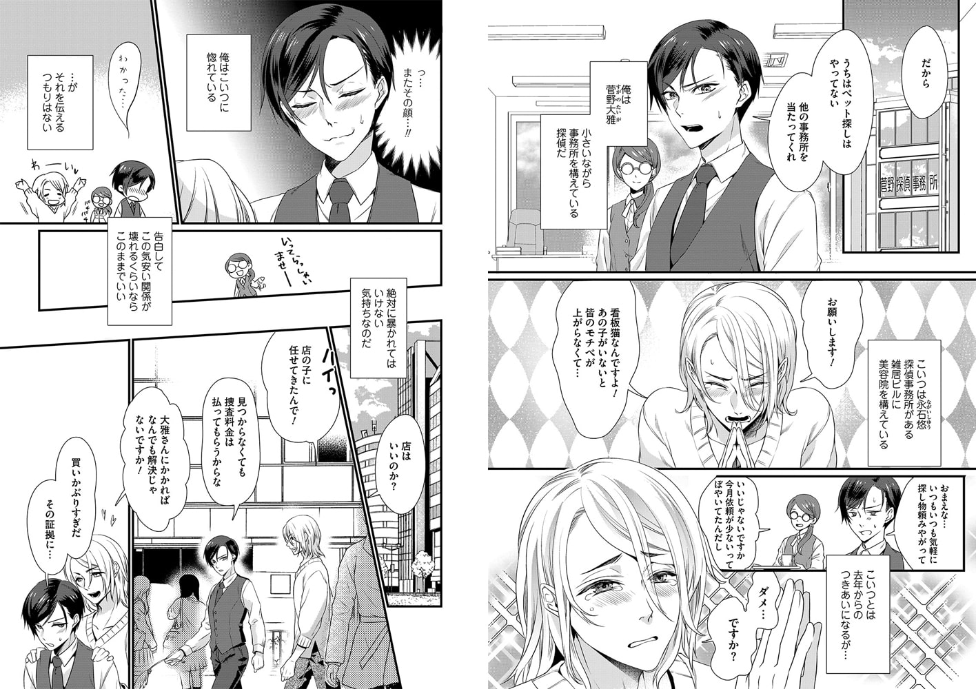 小さいながらも探偵事務所を構えている菅野大雅。そこへ慌ただしく舞い込んできたのは、美容院のイケメンオーナー・永石悠で、「看板猫を探してほしい」と依頼される。そっけない応対をする大雅だったが、実は悠は想い人で…
