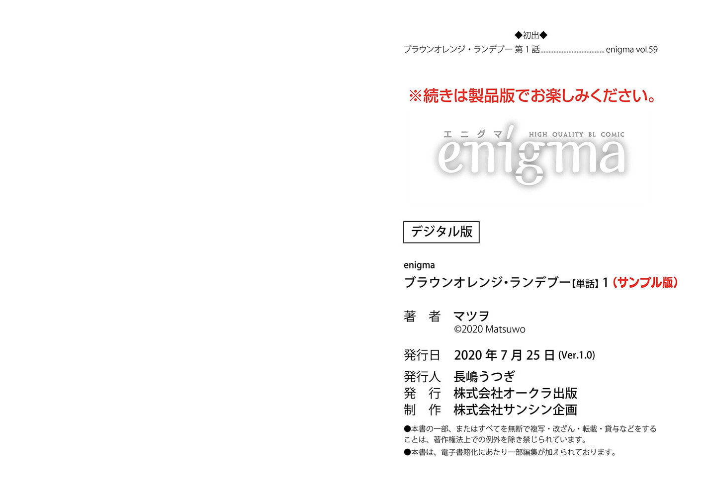 【本作はWEB雑誌「enigma」に収録されています。重複購入にご注意ください。】