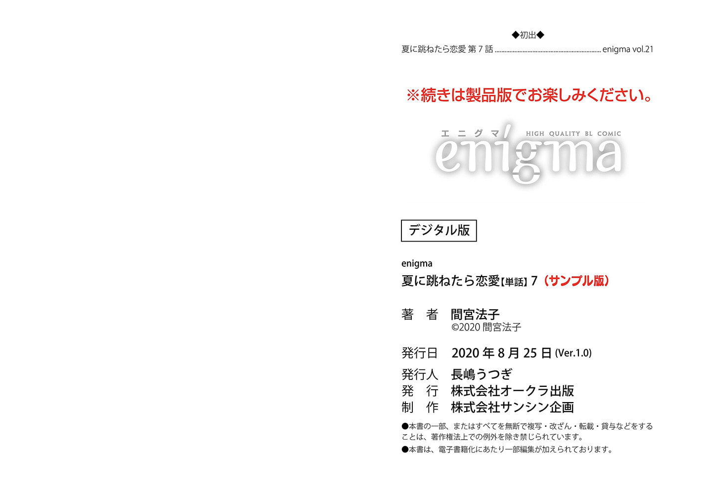 【本作はWEB雑誌「enigma」及び、enigmaコミックス「夏に跳ねたら恋愛」に収録されています。重複購入にご注意ください。】