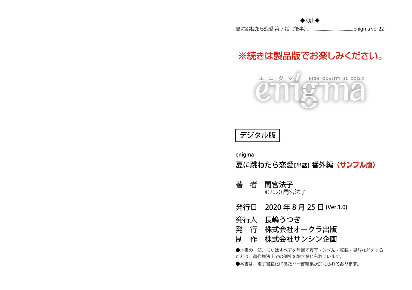 【本作はWEB雑誌「enigma」及び、enigmaコミックス「夏に跳ねたら恋愛」に収録されています。重複購入にご注意ください。】