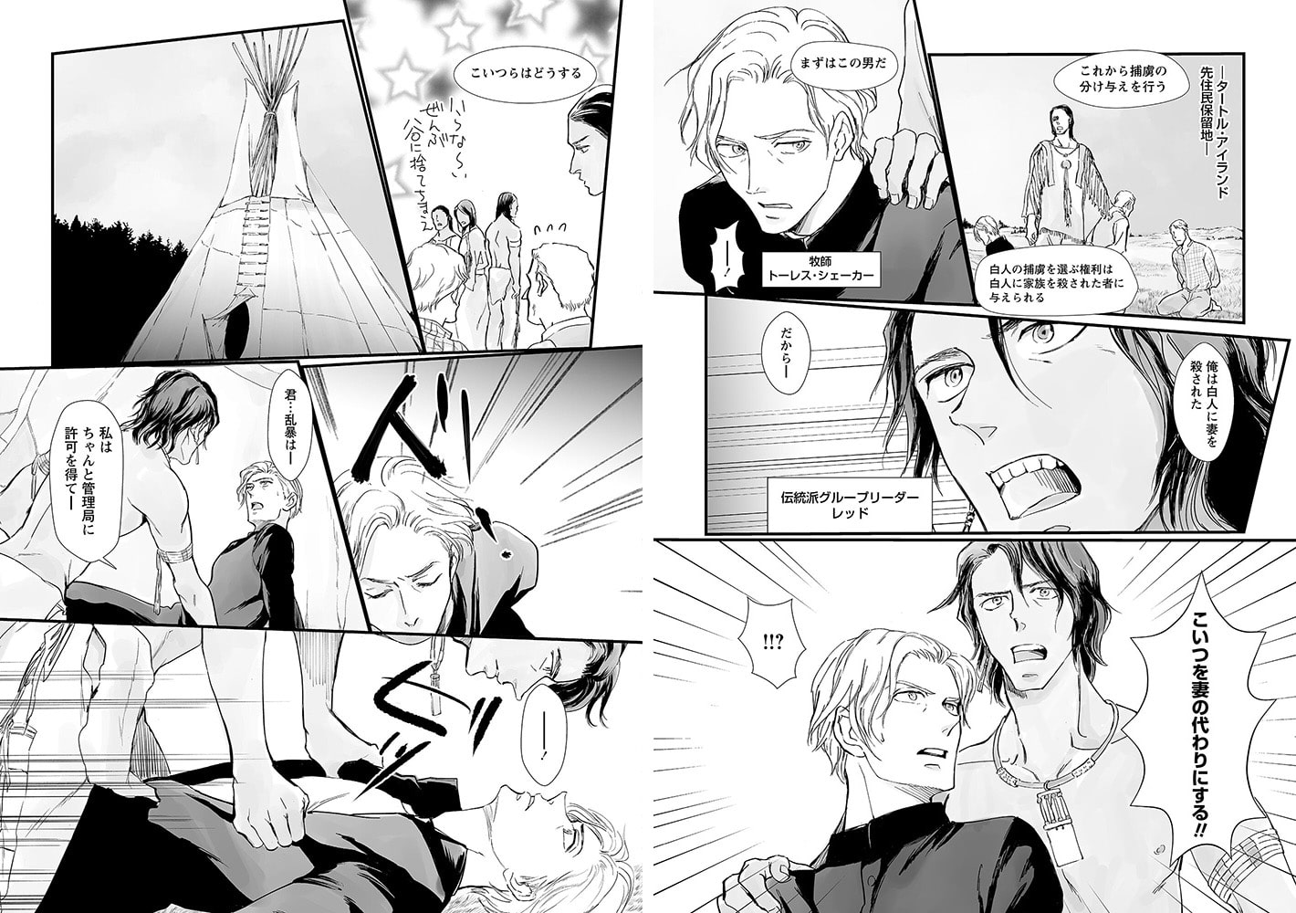 とある理由で先住民保留地に訪れた牧師・トーレスは、捕虜となってしまい、強靭な肉体と美しさを持つリーダーのレッドに、「妻」として貰いうけられてしまった。