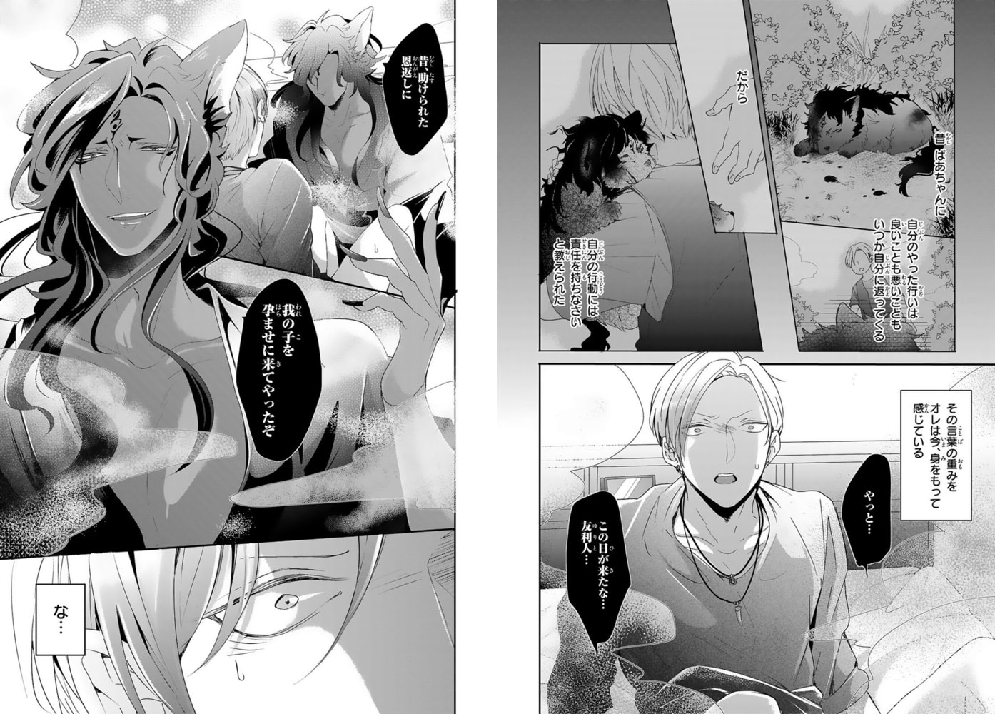 「我の子を産むことが失禁するほど嬉しいか」ヤリチンの俺が、偉そうなケモ耳男に上も下も犯されビショビショに…!?獣医学部に通う遊び人の友利人は、人間や動物を問わず『雄に悉く避けられ嫌われる』といった特異体質に悩まされていた。一方、女とは奔放な性生活を送っていたが、腹の熱くなるような疼きは女では解消できずア●ニーで何とかやり過ごしていた。そんなある夜、ア●ニーの真っ最中に、突然まっ黒で大きな獣が現れアソコを舐めてきて!?さらに「助けられた恩返しに我の子を孕ませにきてやったぞ」と人型になった神を名乗るケモ耳男にあっという間に押し倒されると、自分じゃ届かなかった奥を擦られ――…気持ち良すぎて……!!!!