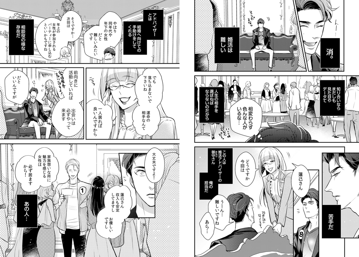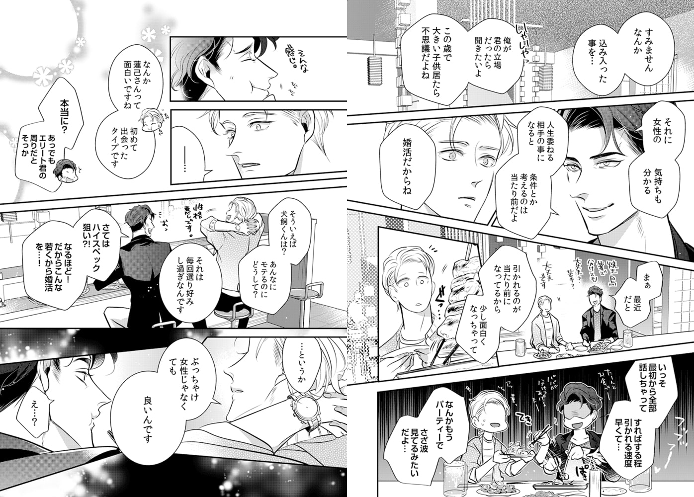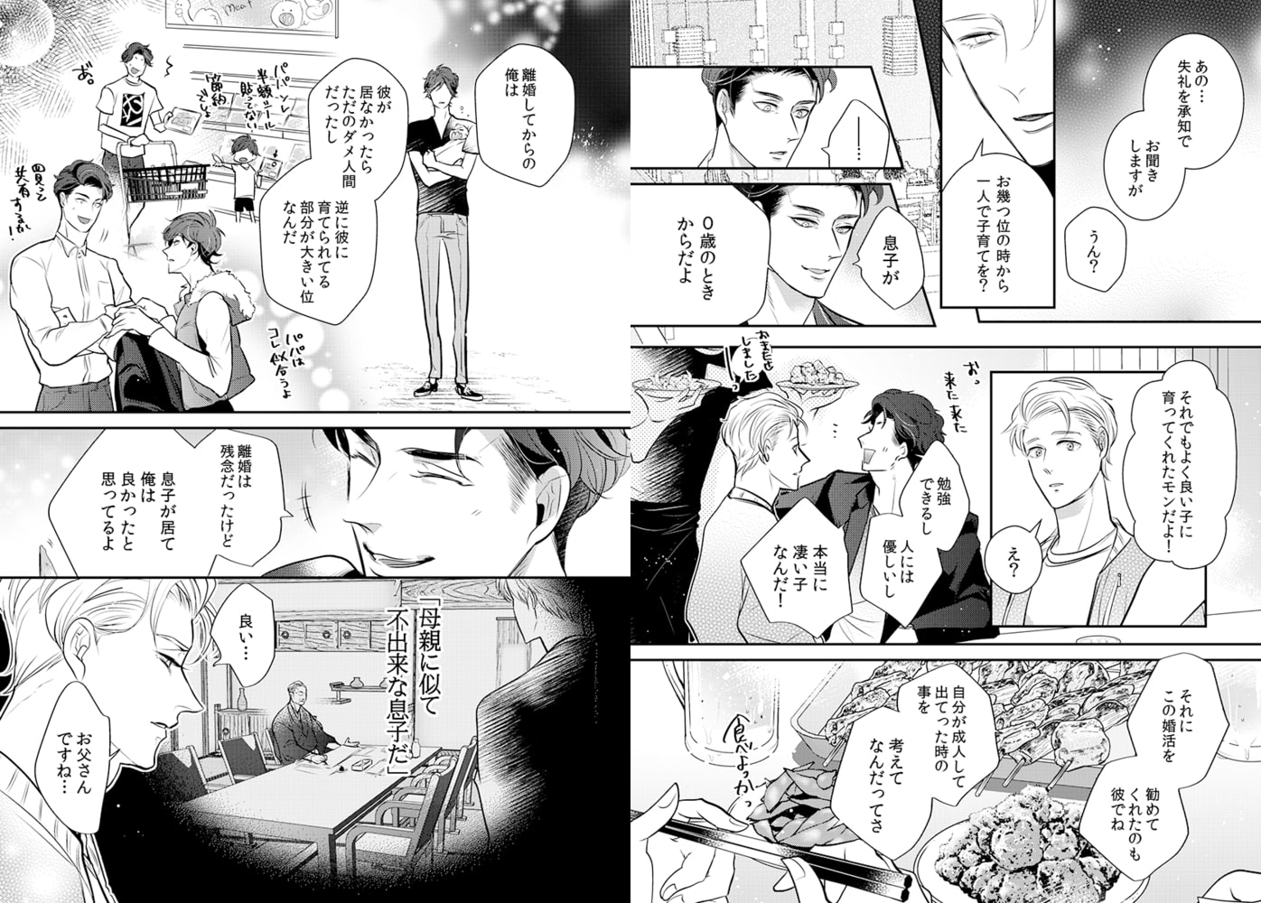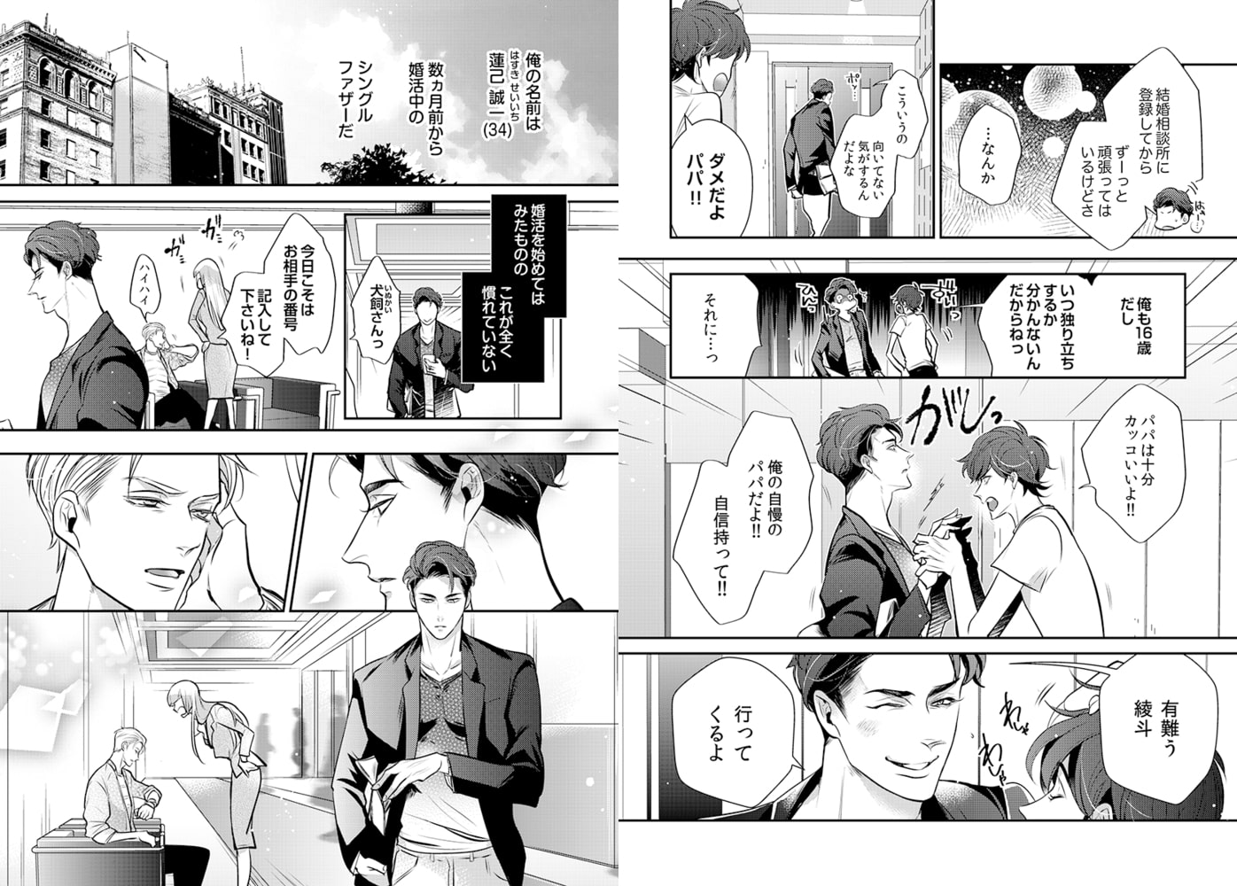 「綺麗ですね…蓮己さんの乳首、目の色素と一緒で薄いピンク色だ」「恥ずかしいよ…気にしてるんだから…っ」ってあれ?お酒のせいかな、今すっごいドキドキしてる……ーーデザイナーでシングルファザーの蓮己誠一(はすきせいいち)は、息子の勧めで一念発起して婚活中。しかし愛息子への溺愛っぷりが空回りし、マッチする相手に中々出会えない日々を過ごしていた。そんなある日、同じ婚活パーティーに出席していた若くてエリートの犬飼と意気投合し、あれよあれよという間に深い仲に…。息子のため必死に仕事とパパを頑張りながら、実は誰かに甘えてみたい…と思っていた中、魅惑的な言葉で誘われ、今までにない心地良さを感じるも、次第に互いに抱えた悩みが明るみに…腹黒ダークエリート攻×ピュアで大人なハスキー受!?な胸キュン必須な恋☆