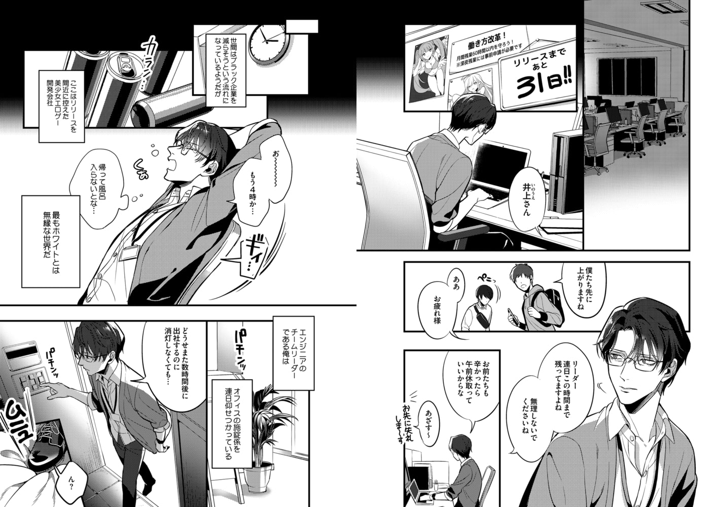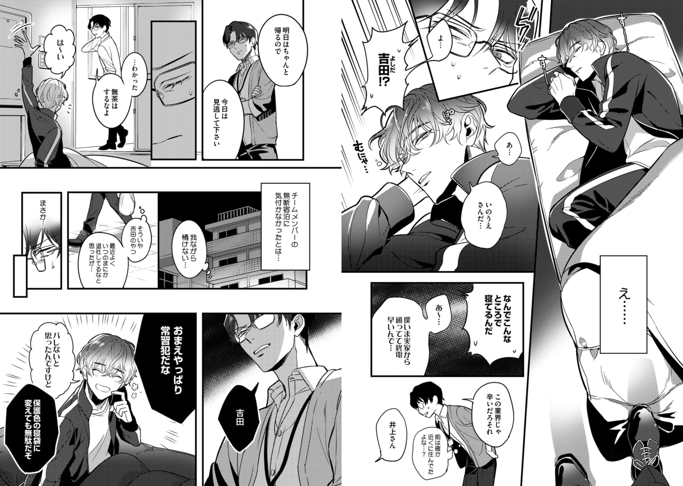 マノ「上司がワンルームで発情してます」ブラック体質なエロゲー開発会社で働く吉田と上司の井上は、なぜか会社で借りたワンルームをシェアすることになってしまう。しかも純愛エロゲーが売りなのに、上司のSM緊縛プレイ好きが吉田にバレて…!?