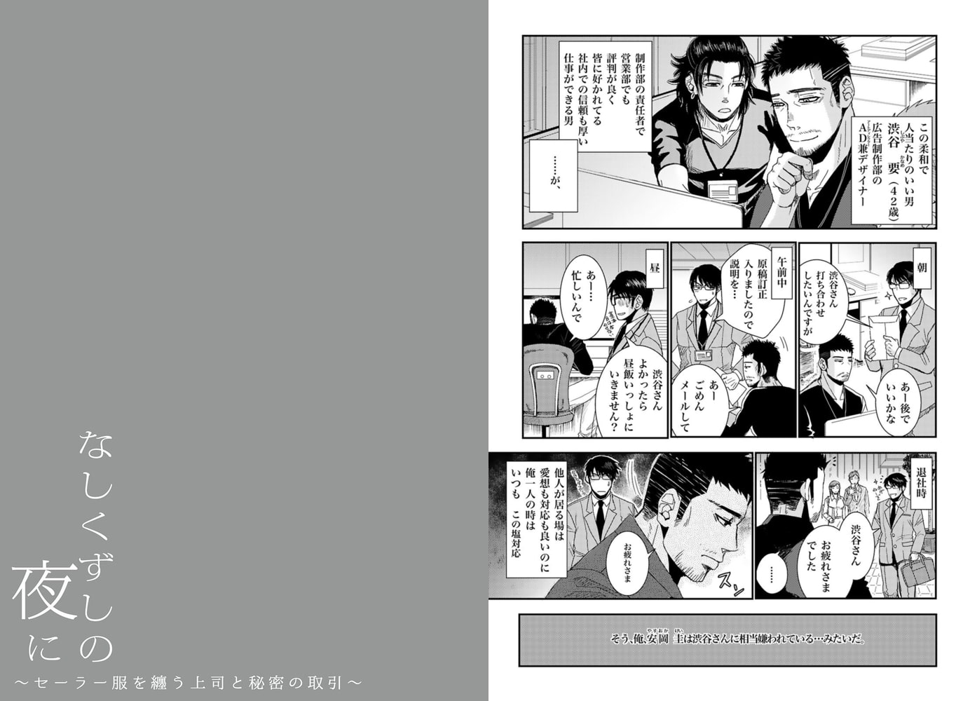 営業でゲイの安岡は、人当たりのいいイケオジとして社内で評判の広告制作部の責任者・渋谷に何故か嫌われている。当の安岡は心当たりもなく疑問に思っていたそんなある日、会社で残業していると、制作部の方から聞こえる怪しげな物音に気付く。気になった安岡は様子を見に行くと、そこにはセーラー服にロングヘアのウィッグを被った渋谷が居て!?事情を聞こうにもあくまで上からな態度の渋谷に苛立った安岡は、渋谷を押し倒し「俺を楽しませることが出来るならこの事は黙っててもいいですよ」と、スカートの中の女物の下着の中を弄りながら、取引を持ちかけて…?