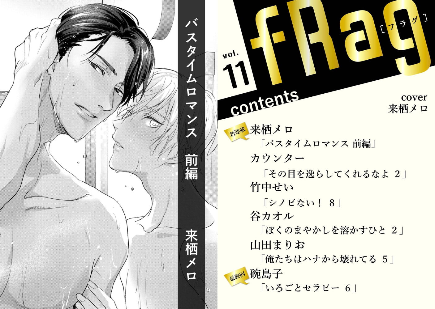 心に刺さる甘さと刺激たっぷりな電子書籍オリジナル新BLマガジン『fRag(フラグ)』 第11号は来栖メロ先生の『バスタイムロマンス』が新連載&カバーで登場!! 読者モデルの律が先輩から貰った怪しい入浴剤を使ったら、理想そのものの全裸男がお湯から現れた。律は男に強引に気持ちよくさせられてしまい……!? そのほかカウンター先生の『その目を逸らしてくれるなよ』第2話、竹中せい先生の『シノビない!』第8話、谷カオル先生の『ぼくのまやかしを溶かすひと』第2話、山田まりお先生の『俺たちはハナから壊れてる』第5話、そして碗島子先生の『いろごとセラピー』はいよいよ最終話!! 画家×自傷癖のある銀行マンの想い合う二人の究極のセラピーとは……!? ますます目が離せないとっても豪華な6本立てです!!
