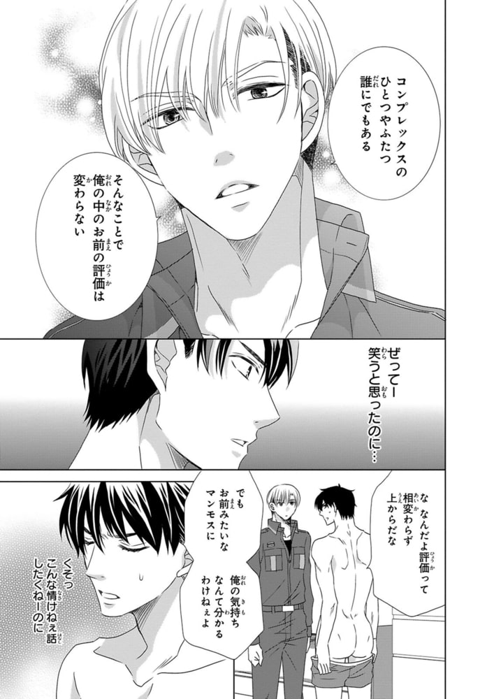 消防学校で日々訓練に励む目黒は、負けず嫌いで脳筋ド直球な性格。同室のスカした口の悪い尾崎といつも競い合う日々。いつも勝敗は五分五分だけど、目黒には男として尾崎に敵わない事が…。それは、アソコのサイズが自分はチンアナゴ級なのに、尾崎はマンモス級な事!絶対バカにされる、と短小を日常生活の中で必死に隠す目黒。隠しきっていたのに、ある日尾崎にチンアナゴを見られてしまい!? 「大きくしてやるよ」とそのまま押し倒され、アソコを扱かれ乳首を舐められ…感じすぎて頭が真っ白になっているのに「これがちんトレだ」と言われお尻の穴に指が!?そこはちょっと待って――!同室がライバルから協力者に!?Hなトレーニングの開幕!