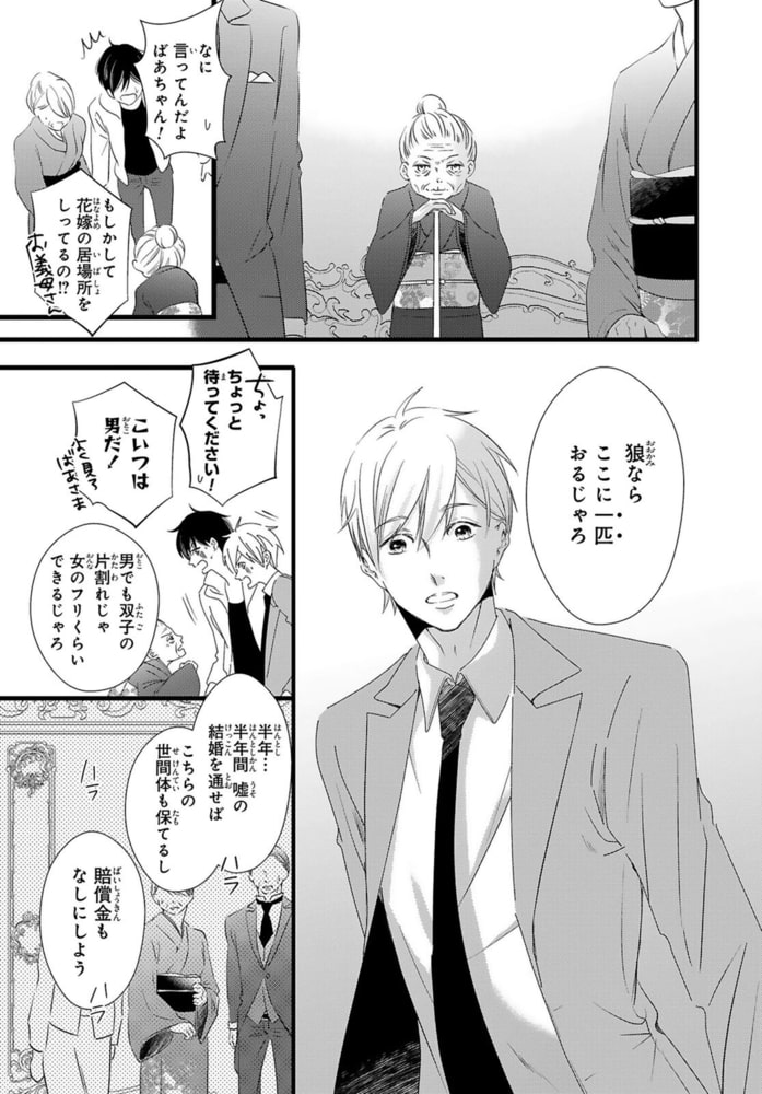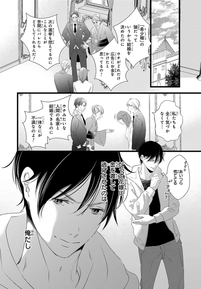 今日から俺たちの偽りの夫婦生活が始まった――。式前日に希少種である狼獣人の花嫁に逃げられた秀生。実は犬の獣人に惹かれてばかりのヤリチンの秀生が、この政略結婚をぶち壊すために計画したことだった。うまくいったと思ったのに、もう一人の狼獣人であり花嫁の双子の兄の郁が妹の振りをして結婚することに!?口うるさい郁にはじめは反発ばかりしていた秀生だったが、狼の姿になった郁がむかし出会った犬獣人と似ていて…?表題作の他、惚れ薬で乳首を好きになってしまう短編作「惚れCHIKUBI」も収録☆