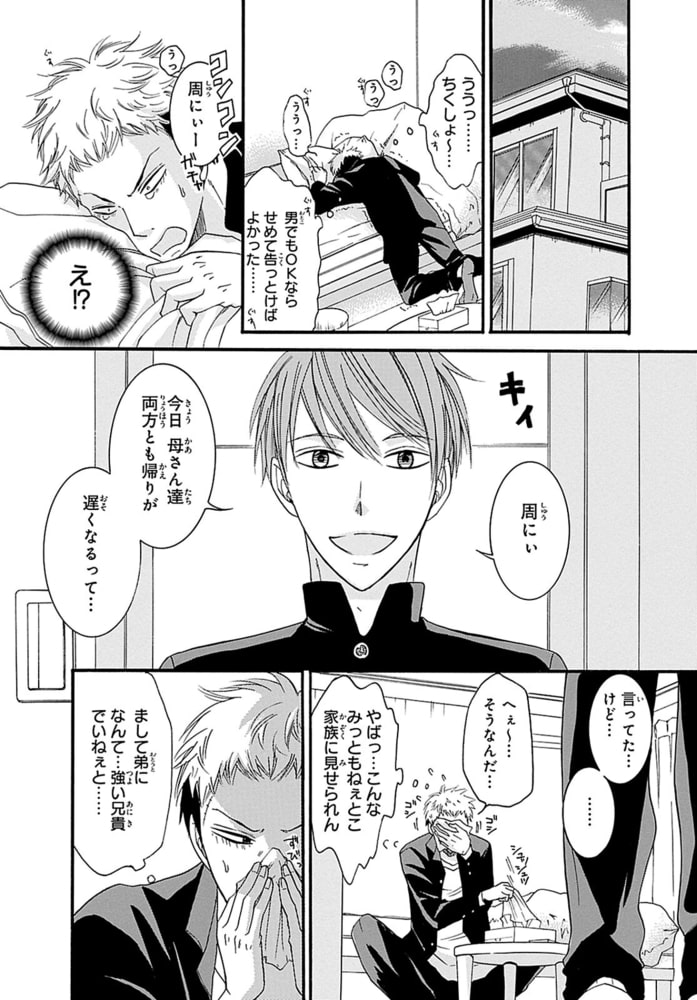 可愛がっていた、俺が守ってやらないとと思っていた。そんな弟に組み敷かれ縛られ、ア●ルを開発されてしまい――。喧嘩には自信があるヤンキーの周人と、成績優秀な優等生の天馬は、全てが正反対だが仲の良い義兄弟。それなのに、失恋して泣いていた兄をみた瞬間、天馬の中で何かが壊れ…。抑えつけ無理やり兄のモノをしゃぶる天馬。更に、ア●ルを弄り始め!?必死に抵抗するけど全く敵わない!痛がる兄に「痛そうだったから、これ。」と持ってきた電マを押し当て!与えられたことの無い振動に快感が全身を走り…一気に吹きだすしおに頭が飛びそうな中、容赦なくナカを擦られ…義弟に処女を奪われ、兄としての威厳もプライドもへし折られ――。