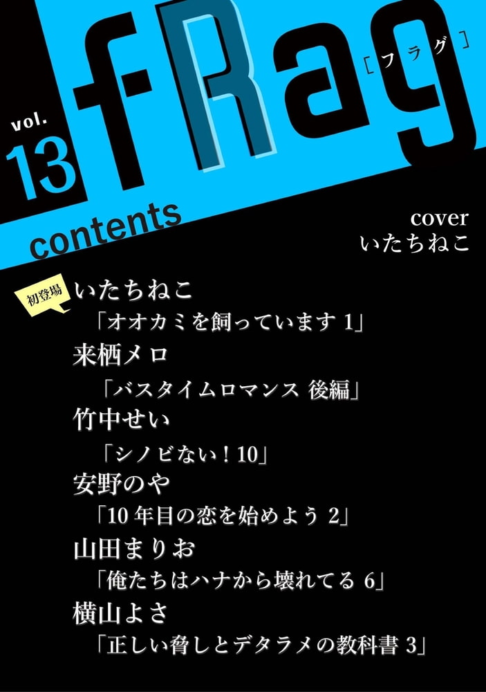 心に刺さる甘さと刺激たっぷりな電子書籍オリジナル新BLマガジン『fRag(フラグ)』 第13号はいたちねこ先生が『オオカミを飼っています』でデビュー&カバーで満を持しての登場!! 「いの」の同居人は同じ会社のよく知らない男「太一郎」。年下で顔が良くて器用で、しかし何故か「いの」に恋している。飼い主と犬のように暮らしていた二人だが…!? そのほか来栖メロ先生の『バスタイムロマンス』後編、竹中せい先生の「シノビない!』第10話、安野のや先生の「10年目の恋を始めよう』第2話、山田まりお先生の『俺たちはハナから壊れてる』第6話、横山よさ先生の『正しい脅しとデタラメの教科書』第3話を収録。新展開あり佳境ありの読み応えたっぷりな6本立てです!!