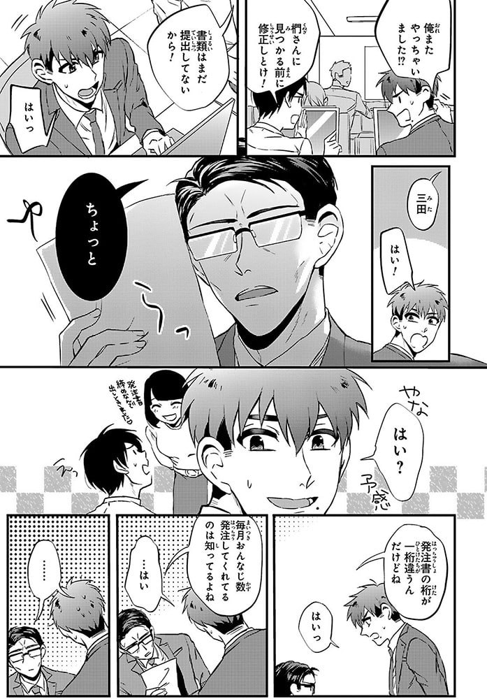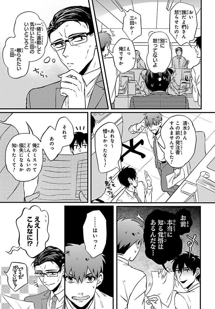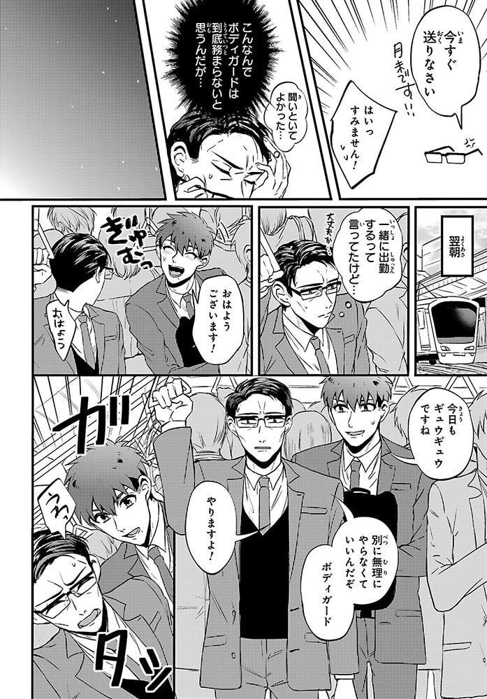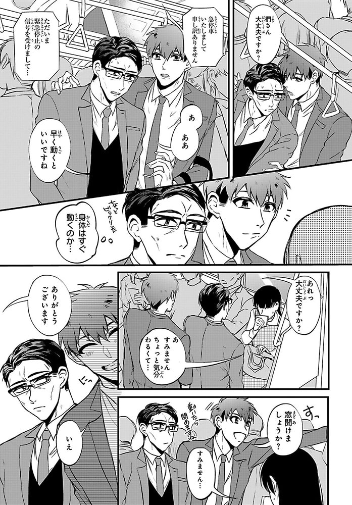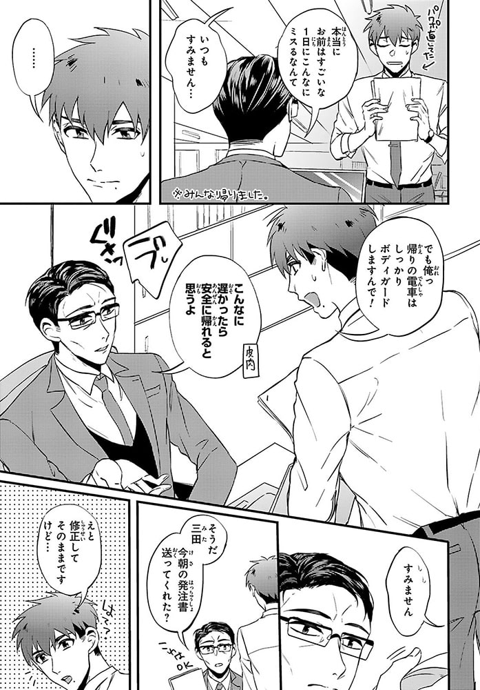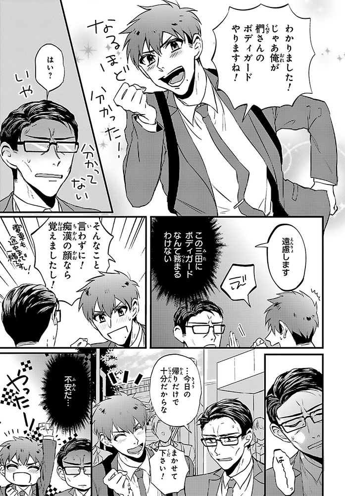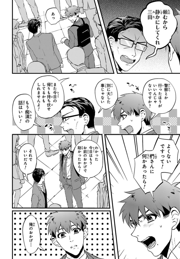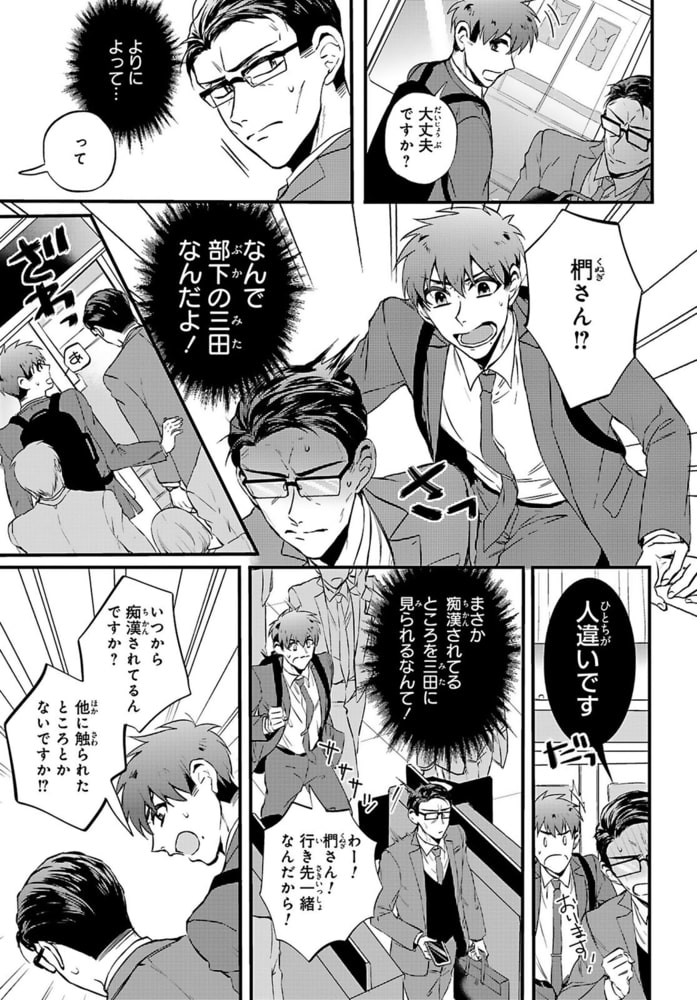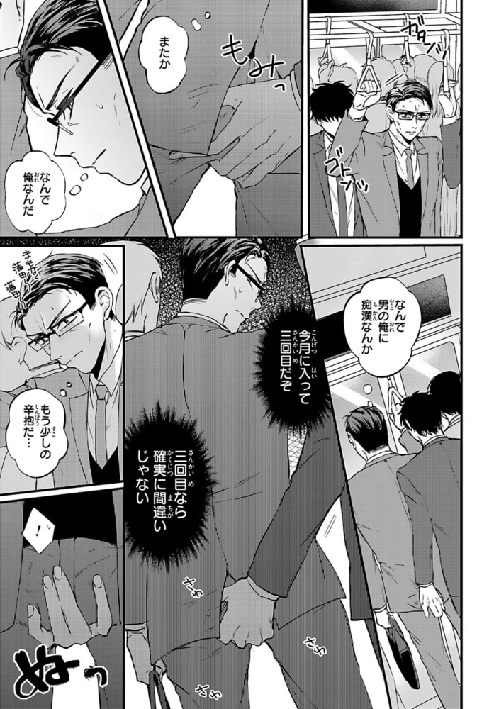 「なんで俺なんだ…!!」今月に入ってからなぜか痴○に遭うようになってしまった椚 弘(くぬぎひろむ)。おっさんの尻なんて触って何がいいのかさっぱりわからないまま今日も耐えていたが、痴○がお尻だけではなく股間のほうへ手を這わせてきて…焦る椚を助けてくれたのは…部下の三田!?よりによって直属の部下に助けられた椚はごまかそうとするもごまかしきれず…三田の勢いに押されボディーガードを頼むことに。しかし三田は仕事でミスが多く、椚の怒りをしばしば買うタイプで…不安に思いながらも徐々に三田を信用し始め…。ある日また痴○に遭ってしまい、助けを求めるも今度は三田が椚を痴○していて…!?