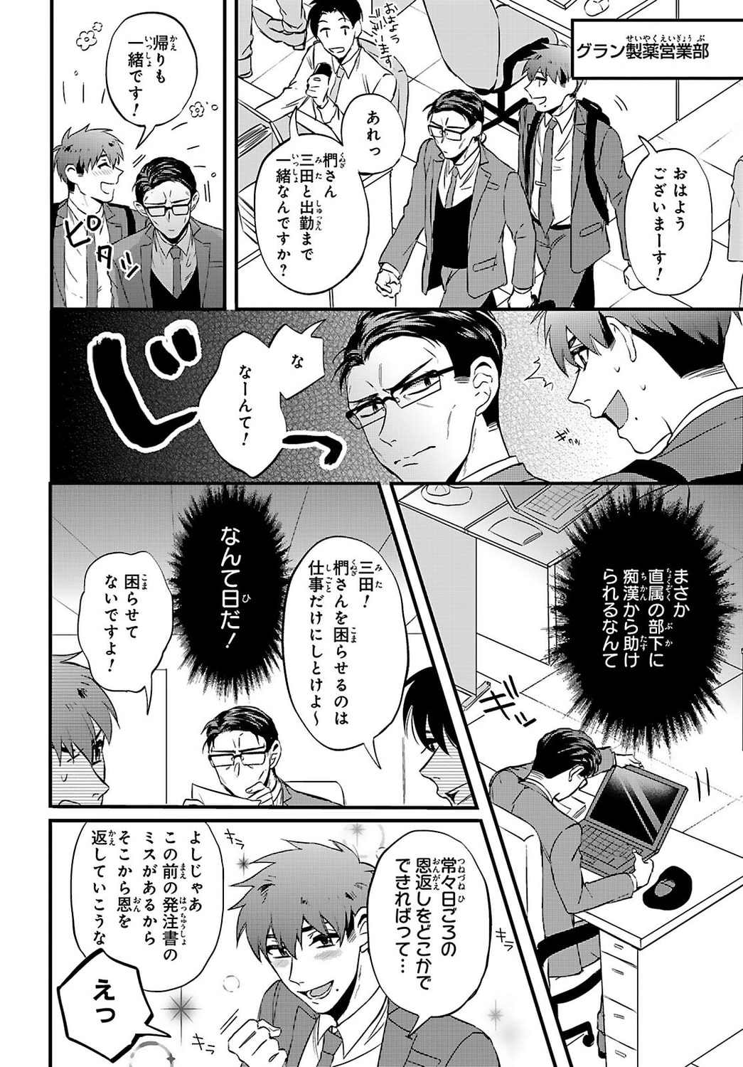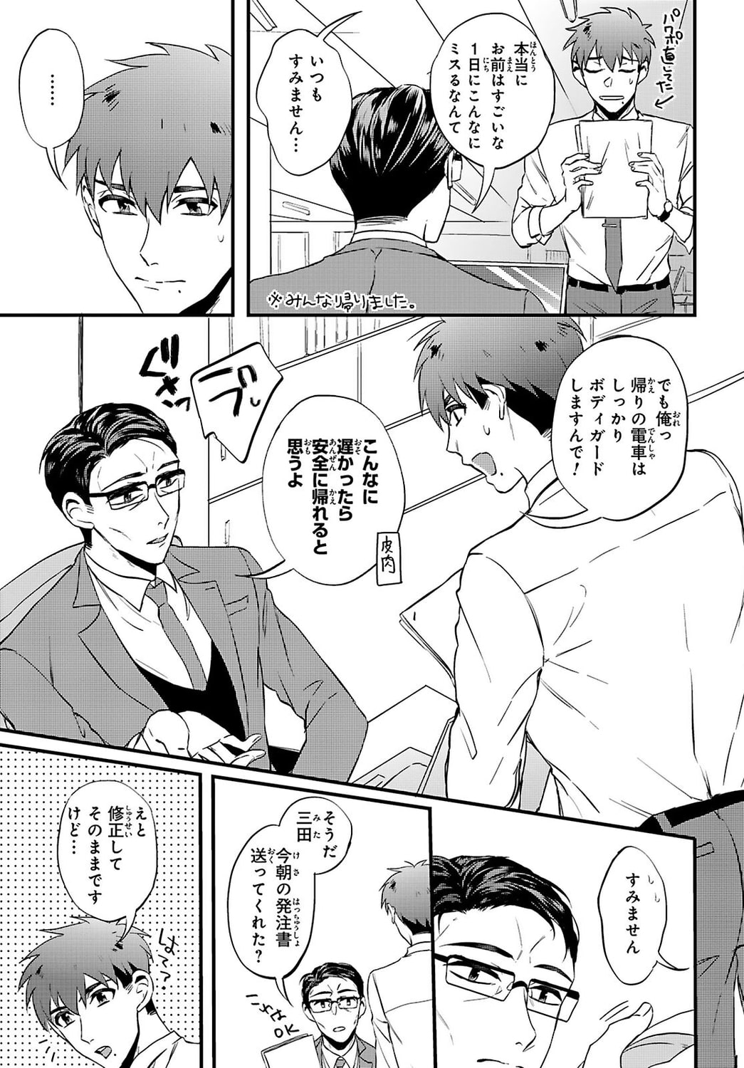 「なんで俺なんだ…!!」今月に入ってからなぜか痴○に遭うようになってしまった椚 弘(くぬぎひろむ)。おっさんの尻なんて触って何がいいのかさっぱりわからないまま今日も耐えていたが、痴○がお尻だけではなく股間のほうへ手を這わせてきて…焦る椚を助けてくれたのは…部下の三田!?よりによって直属の部下に助けられた椚はごまかそうとするもごまかしきれず…三田の勢いに押されボディーガードを頼むことに。しかし三田は仕事でミスが多く、椚の怒りをしばしば買うタイプで…不安に思いながらも徐々に三田を信用し始め…。ある日また痴○に遭ってしまい、助けを求めるも今度は三田が椚を痴○していて…!?