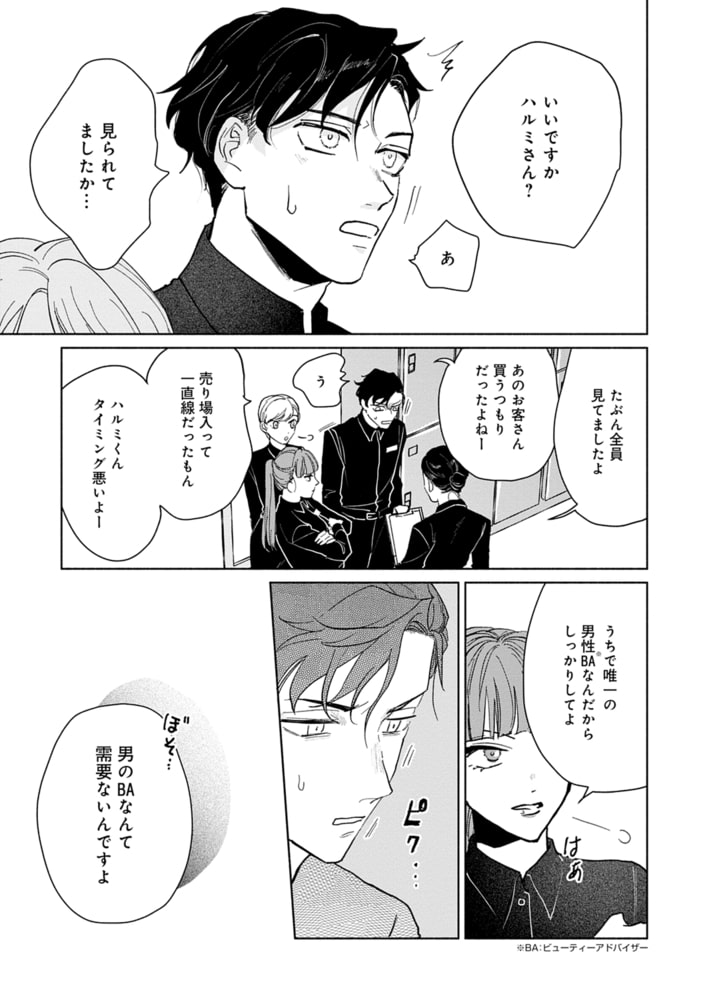 コスメブランドのビューティーアドバイザーとして働くハルミは接客が下手で成績を伸ばすことができず思い悩む日々を送っていた。