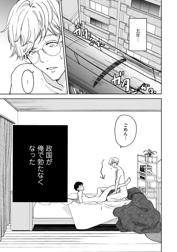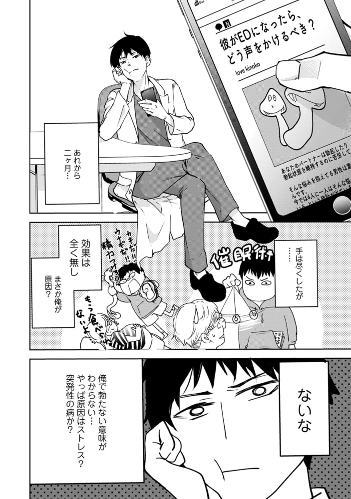 外科医である明兎と薬の配達員である政国は、明兎からの強○的な告白で付き合い始める。平和な恋人期間がずっと続くと思っていた五年目、政国がEDになるという、カップル最大のピンチを迎えていた…。明兎のご奉仕努力もむなしく反応しない政国。そんな日々が長く続いたある日、公園で悩んでいた明兎が襲われる事件が起こり…。仲良しカップルの一大事!果たして乗り越えることはできるのか…? 表題作の全五話を収録。 コミックス版に後日談を描きおろしたおまけコミック、更に配信版限定描きおろしコミックを4ページプラスした特別版です。
