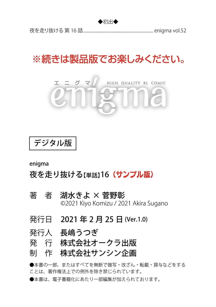 【本作はWEB雑誌「enigma」及び、enigmaコミックス「夜を走り抜ける」に収録されています。重複購入にご注意ください。】