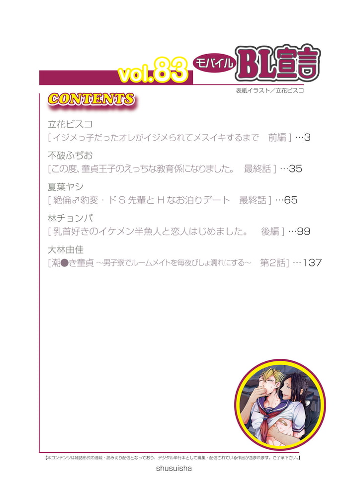 【モバイルBL宣言vol.83】表紙&巻頭カラーは立花ビスコ先生『イジメっ子だったオレがイジメられてメスイキするまで』モテるドS幼馴染×イジメっ子ヤンキーの特訓開発ラブ!ほか豪華連載は不破ふぢお先生『この度、童貞王子のえっちな教育係になりました。』、夏葉ヤシ先生『絶倫♂豹変・ドS先輩とHなお泊りデート』、林チョンパ先生『乳首好きのイケメン半魚人と恋人はじめました。』、大林由佳先生『潮●き童貞 ~男子寮でルームメイトを毎夜びしょ濡れにする~』