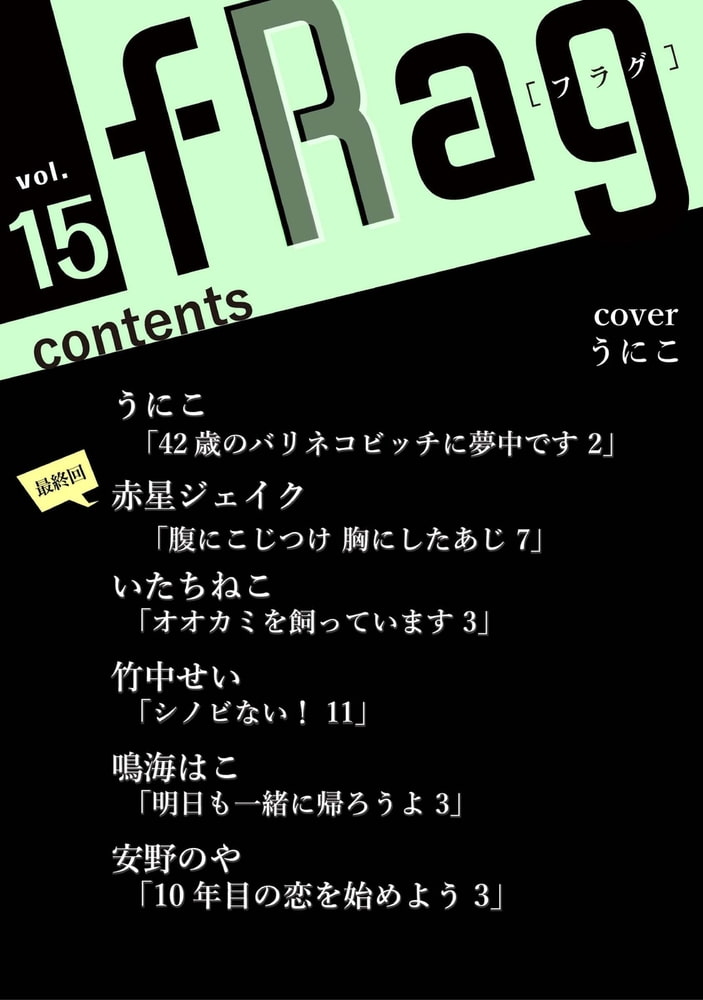 心に刺さる甘さと刺激たっぷりな電子書籍オリジナル新BLマガジン『fRag(フラグ)』 第15号は、うにこ先生のカバーと『42歳のバリネコビッチに夢中です』第2話を掲載!! 堅物かと思いきや実はバリネコビッチだったジァンに告白し、見事玉砕してしまったエドだが諦められず…!? そして赤星ジェイク先生の『腹にこじつけ 胸にしたあじ』はついに最終回!! そのほか、いたちねこ先生の『オオカミを飼っています』第3話、竹中せい先生の『シノビない!』第11話、鳴海はこ先生の『明日も一緒に帰ろうよ』第3話、安野のや先生の『10年目の恋を始めよう』第3話を収録。どんどん面白くなって大満足、必見の6本立てです!!
