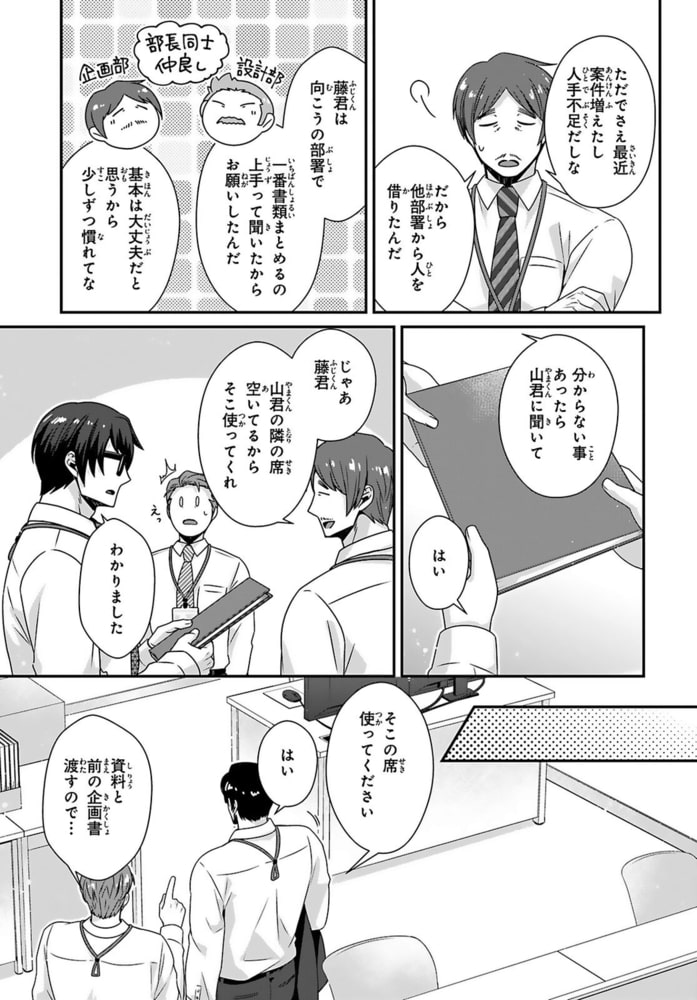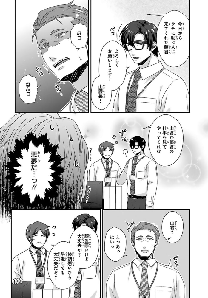 「感じやすい山課長可愛いです」会社のトイレで部下にアソコを咥えられイかされる!?肩に手を置かれただけでも感じてしまう山は、会社のトイレで勃起したアソコを静めようと奮闘していた。そこに、他部署の藤がやってきて!藤に会社のトイレで抜いていることがバレ「終わった…」と思っていたら「おさめるの手伝います」と扱いてきた!?手で触れられたら感じるからやめるように話すと、「手が使えないなら口で」とフェラをしてきて!?あまりの快感に盛大に射精し、藤のシャツを精液まみれにしてしまい…イケメンだけど無口で何考えてるかわからない部下×感じやすい社畜おじさん上司のトイレの個室SEXから始まった恋の行方は――!?