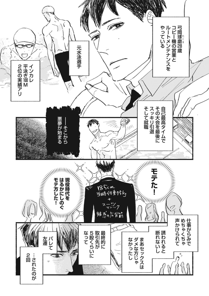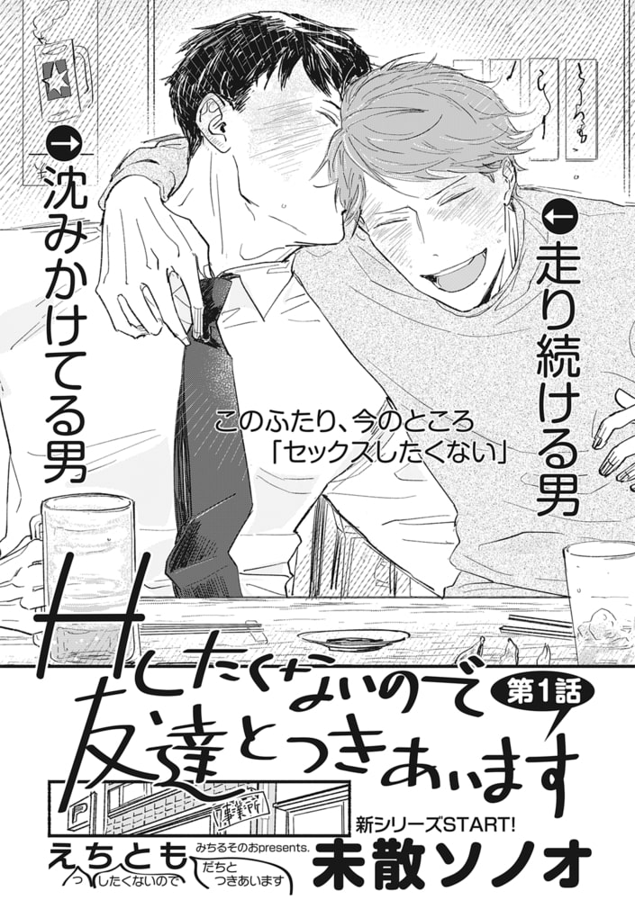 ●未散ソノオ[Hしたくないので友達とつきあいます 第1話]モテすぎて不遇な営業マン・弓岡は元水泳選手。大学同期の駅伝部・犬塚と再会、意気投合し…!?