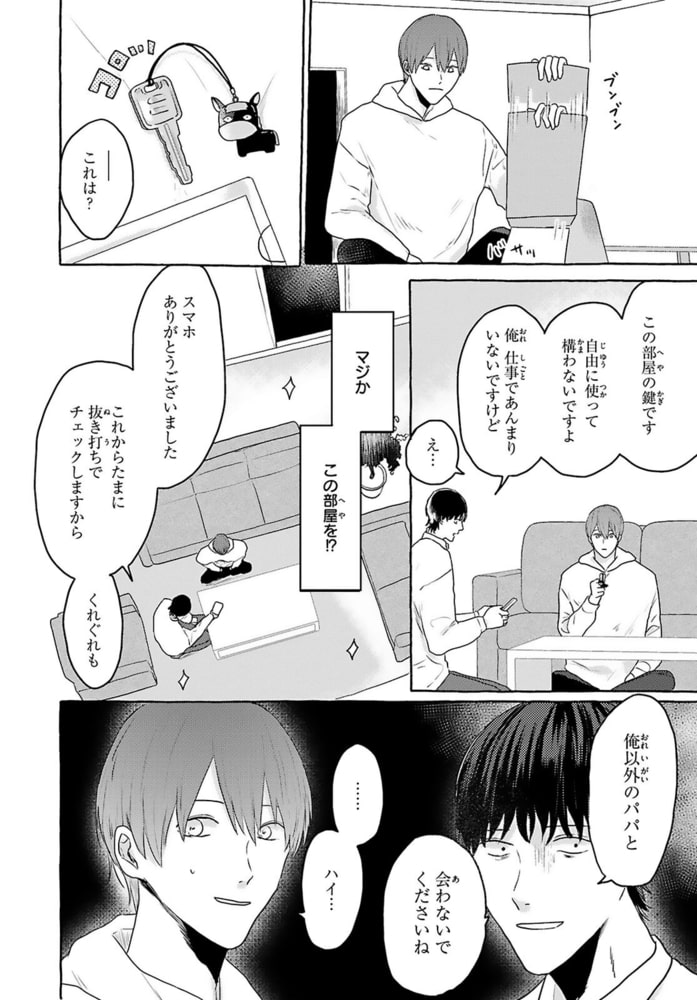 金のため、金のため、すべては金のため――!!ちょろいお金持ち相手にパパ活で生計をたてている未来。これが天職だと思っていたある日、新しいパパとして待ち合わせ場所にやってきたのは、かつて自分をよく見つめていた変わり者の元同級生・沼田だった。さすがに知り合いは…とためらうも、こいつをパパとして育てた方が稼げると思い直しホテルへ直行!大きい体、熱い体温、見たことないほど大きい……アソコ!?今まで相手にしてきたパパたちと違って、若く情熱的な男に主導権を握られてしまい!?なんで俺がイかされてるんだ!!お前が俺に狂えっ…て思うのに、指とアソコで敏感なところを刺激されこっちの方が狂ってしまいそう――!?
