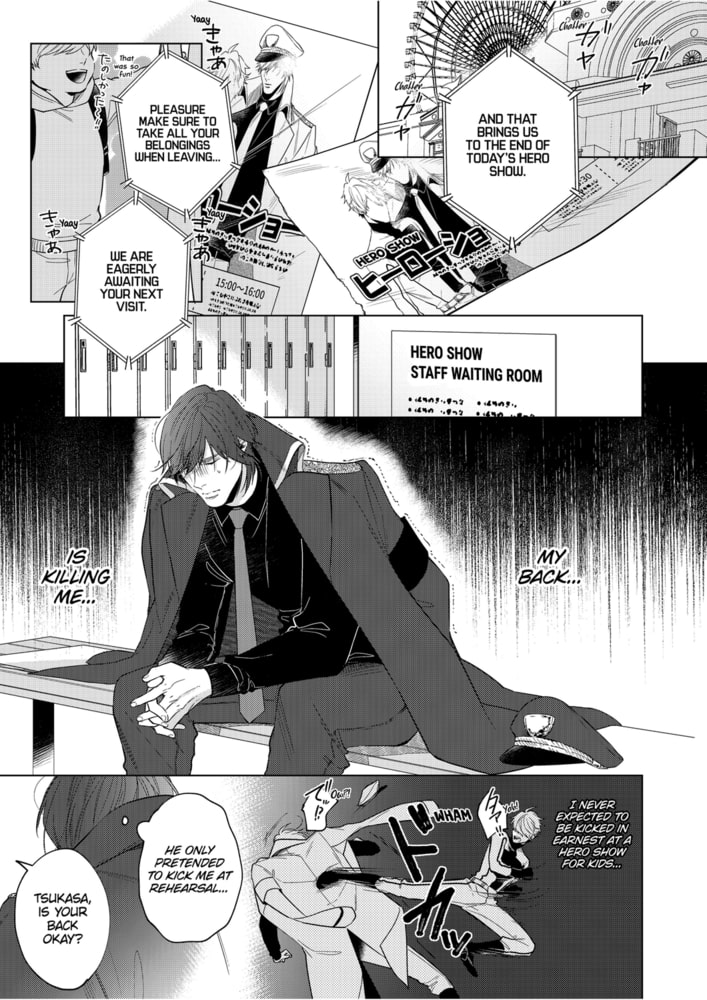 [Dark but loyal villain x sociable but timid hero] Something you want no matter what… Tsukasa, who belongs to a theatre club at university loves his childhood friend Kaname. After finishing their hero show, they decide to drink at Tsukasa’s house. Tsukasa, who is the hero, says he is envious of the villain and then…