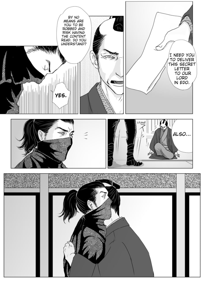 Numasuke, a shinobi in a town in Edo Japan, accepts secret letters from the Roju (elder of the town) to deliver to the young Tono (Lord of the town). Numasuke is ordered to never have the letter robbed or the contents read by others. He is then suddenly “hugged” by the elder and told to “convey this message too”.