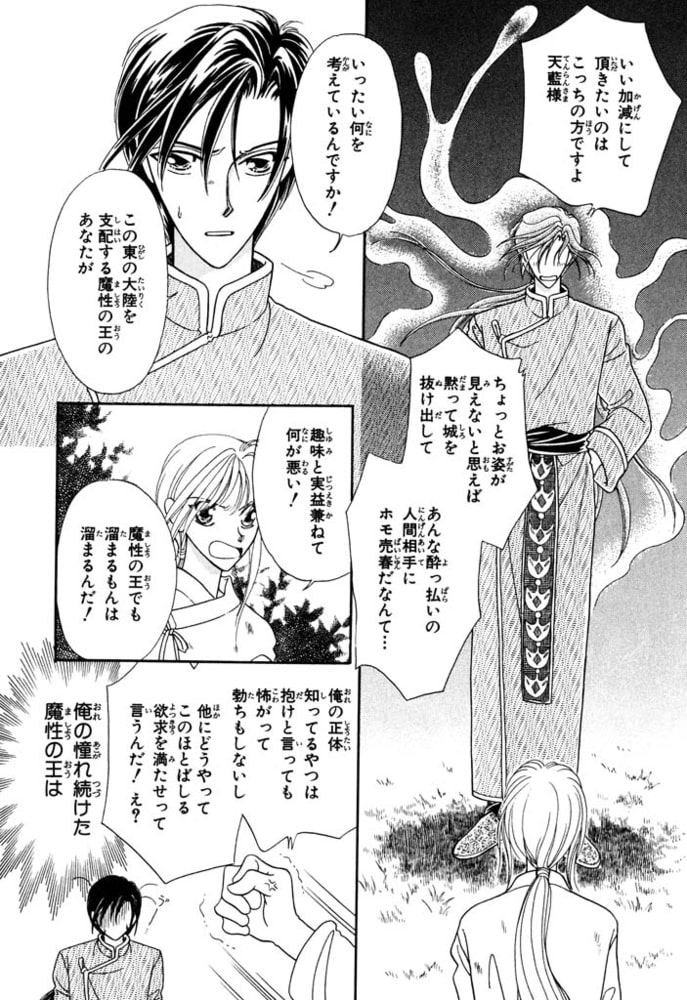 世界には4つの大陸があり、それぞれが魔性の王の手で治められていた。母の遺言で、東の大陸を支配する王・天藍(てんらん)に仕えることになった、竜の体を持つ浅葱(あさぎ)。誰よりも強く、気高く、美しいという天藍は、想像以上に美しく、自信家で──下品で、底意地が悪く……「受」だった……主人と側仕えという立場にありながら、深く魅かれ合う2人のラブ・ロマン。