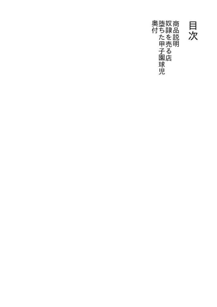体育大学野球部員の雄太は、アルバイト帰りに突然拉致され監禁されてしまう。手足を拘束された状態で、マスターと名乗る男から、性感帯を隅々まで責め嬲られ、秘められたマゾ性を開発されていく。そして、性奴○として人身売買の場に立たされるのだが…。