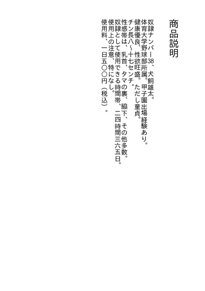 密かに男の性奴○が売買される店『精楼園』。そのショーケースには、美しい若者たちが商品として陳列されていた。その中で、イモ顔体育会系野郎の雄太は異質な商品だった。販売価格は他の奴○の百分の一以下で、客たちは安いチップで雄太を弄ぶ。