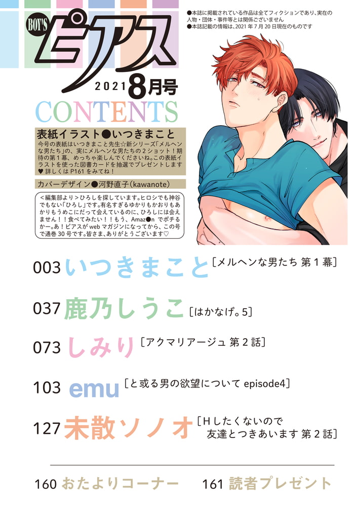 ●今号の表紙はいつきまこと先生!図書カードの抽選プレゼント企画あります。応募締切は2021年8月20日。詳しくは本誌を見てね。