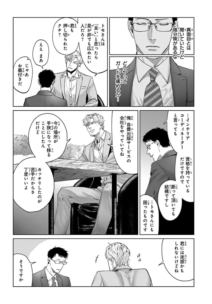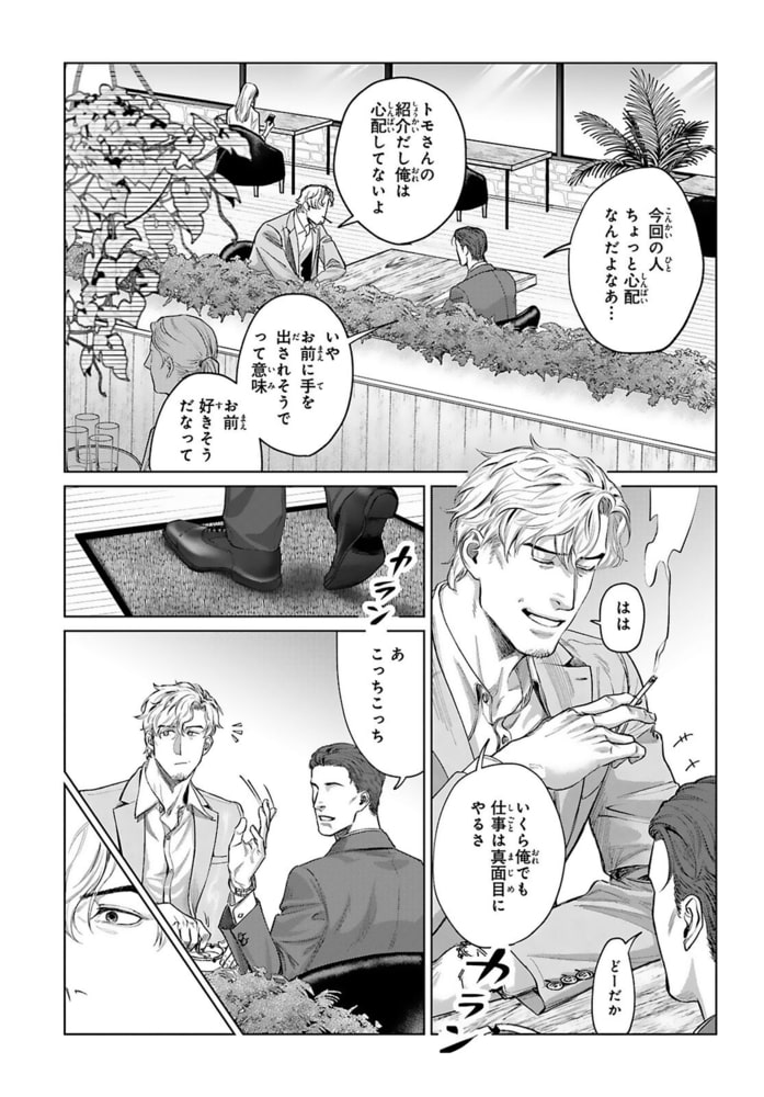 「欲しいと思ったら絶対手に入れたくなっちゃうタチでね」ゲイの柴は友人から仕事相手として佐倉を紹介される。かっちり着込んだスーツに凛とした顔立ちの佐倉に思わず目を奪われた柴。少しでも親睦を深めるため飲みに誘うも“カッチリ分けたいタイプだから”とばっさり断られてしまう。プライベートが全く見えない佐倉だったけどひょんなことから酔った佐倉を家に送ることに。すると今までの生真面目な態度から一変、佐倉が甘えるように縋ってきて…?あまりの豹変ぶりに訳ありかと推測する柴だけど、挿入されたソコを撫でる淫靡な姿に、佐倉のことをどんどん知りたくなって――?