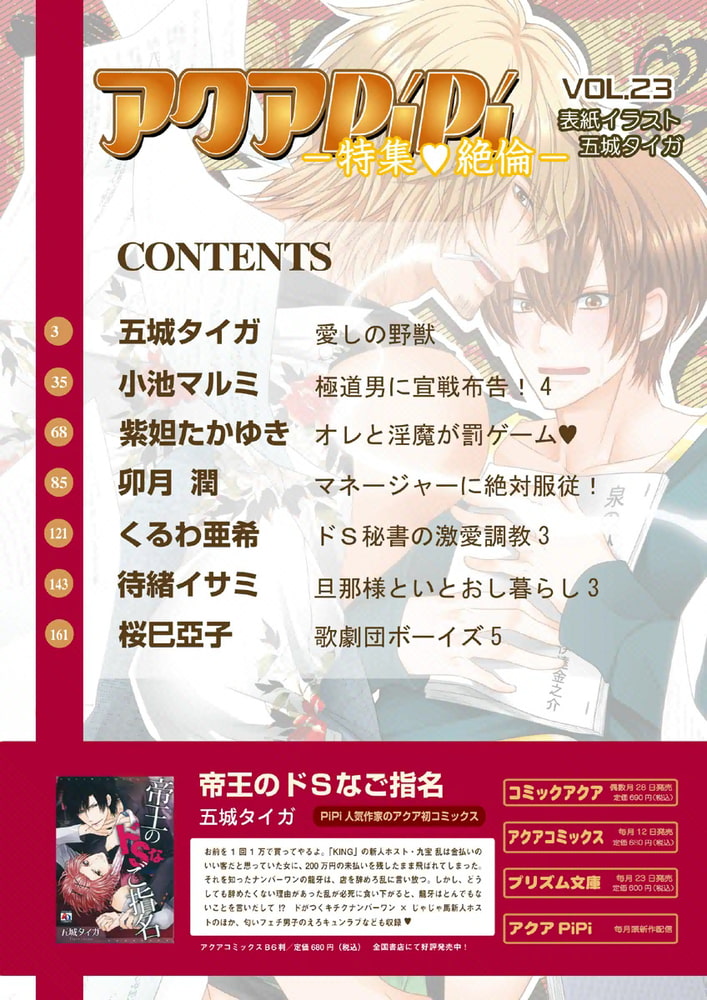 【愛しの野獣】新人俳優と脚本家。今回の見せ場はエッチ次第! 【極道男に宣戦布告! 4】逮捕された大垣は郡山に別れを告げ…… 【オレと淫魔が罰ゲームv】突然、宙に見知らぬ人が現れて? 【マネージャーに絶対服従!】優男風の新マネを、さっそく舐めてかかる人気アイドルだが…… 【旦那様といとおし暮らし3】衣装販売の噂を聞いて壮一郎のもとへやって来て…… 【歌劇団ボーイズ5】公演本番前日。切り裂かれた衣装を見つけ…… 【ドS秘書の激愛調教3】意地悪な元カレも同席する商談の席で……
