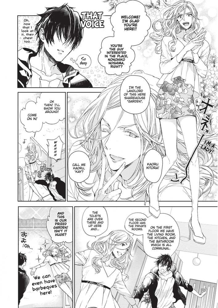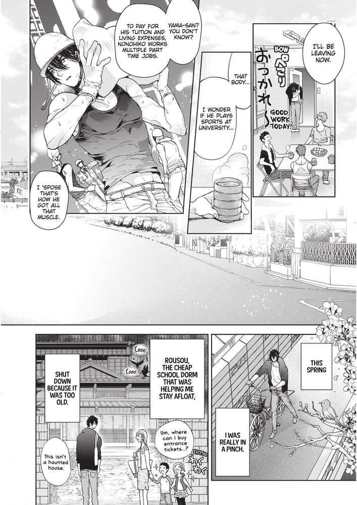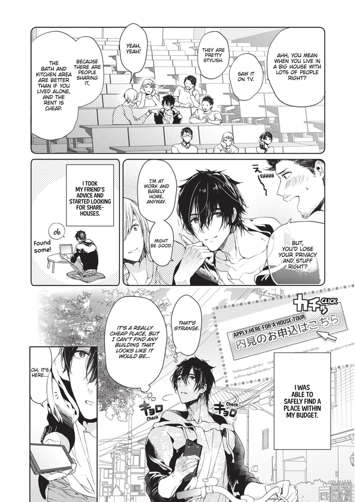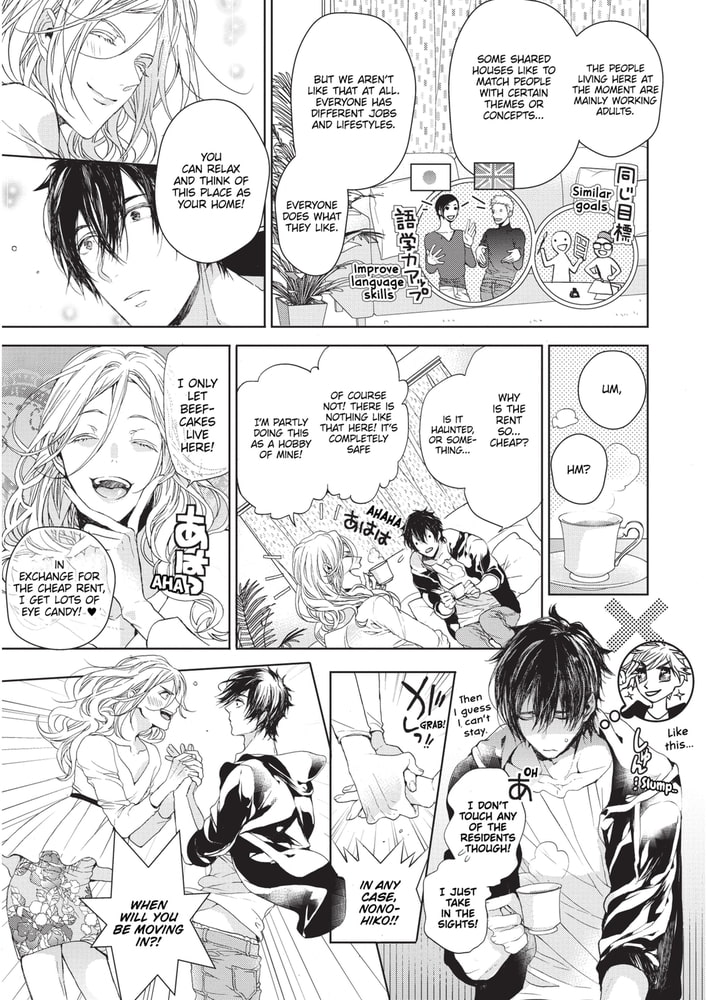 As his cheap college dormitory shuts down, working student Nonohiko gets caught in a predicament where his only salvation is an all-male sharehouse. Despite the beautiful Onee-san (♂) landlady only allowing beefcake hotties room and board, Nonohiko somehow passes inspection. Shouldering some unease, the move-in day dawns. From being invited to bathe with a promiscuous glasses-clad sharehouse roomie, to even being mistaken as a guy down for casual sex――?! Executive glasses guy x Super pure working student. A love sex comedy starting from mistaken identity★