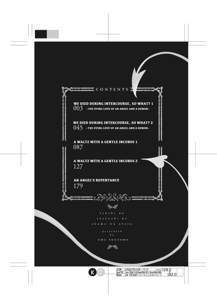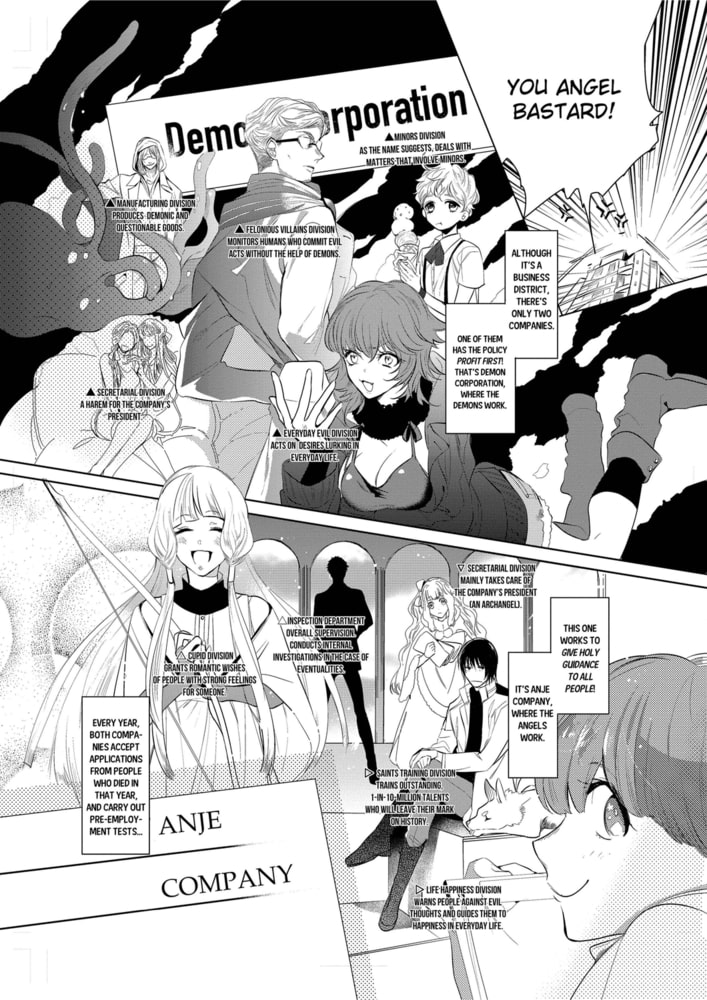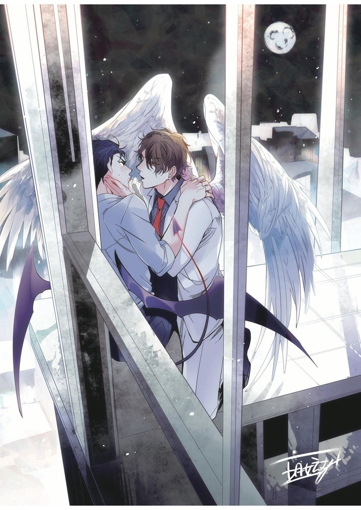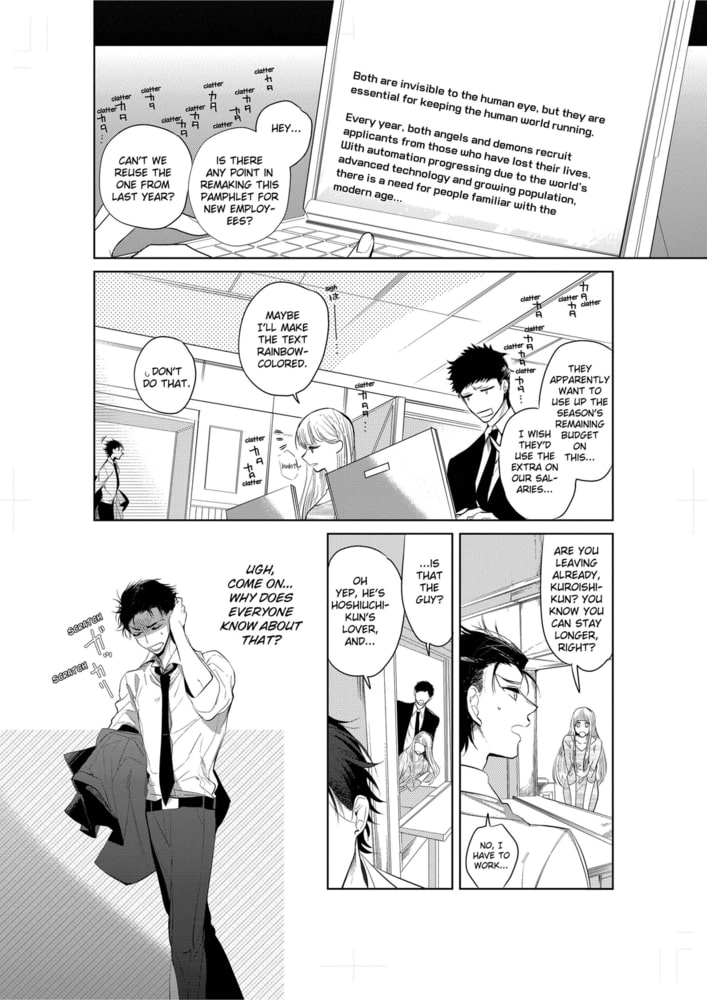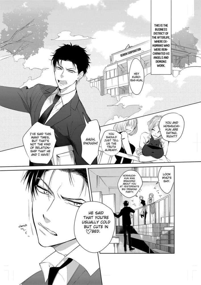 Our story is set in the business center of the afterlife. Humans reborn as Angels and Demons get caught between their present and past in this love story. “So I died while having sex. What of it?” A murderous love between an Angel and Demon! Cause of death: a one-night stand! That is the history shared between the Demon Kuroishi and Angel Hoshiuchi, coworkers at the same company in their past life. “You're really cute in bed!” In contrast to the humming Hoshiuchi, Kuroishi only feels resentment, feeling as though he had been used as a replacement for Hoshiuchi’s girlfriend… This bewitching Angel and gullible Demon enter into a love-hate relationship. “A Waltz with a Gentle Incubus” An Angel who hates Demons, Arima, is ordered to help out the caretaker of a botanical garden, Saeki, who happens to be…an incubus?! Learning about the tragic death of Saeki, whose face is scarred, Arima decides to help soothe the desires of Saeki, who has entered into heat… This is the true love story of a serious and uptight Angel falling in love with a faint-hearted Demon.