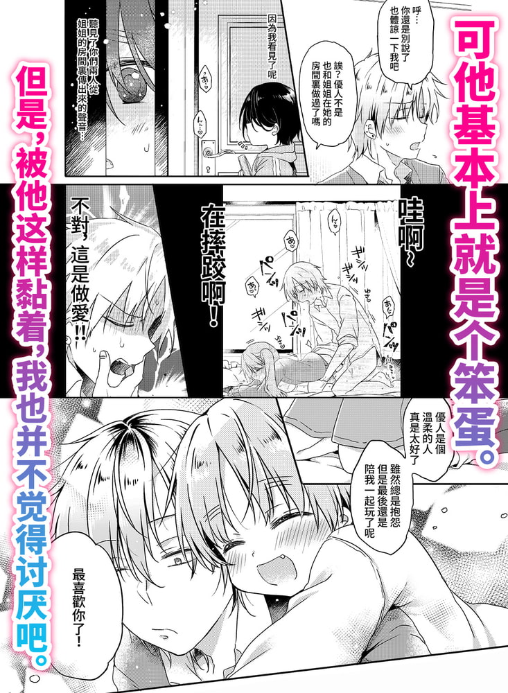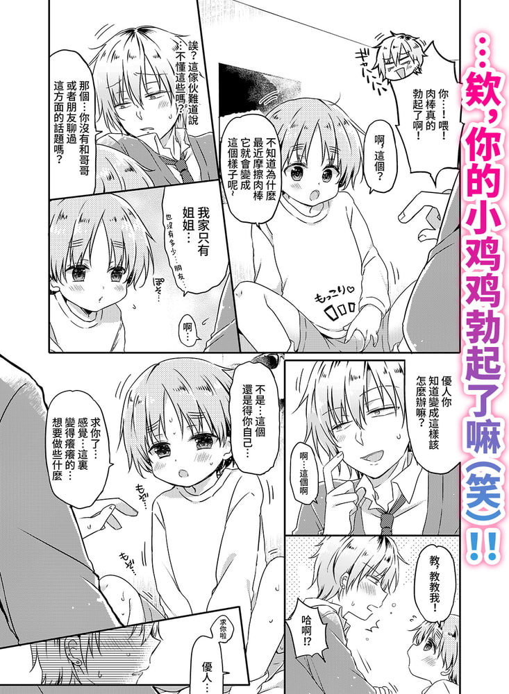 一起变得舒服起来吧…。”这家伙小手的每一次触碰,都会让我涌起异样的感情…不行!这家伙可是我前女友的“弟弟”啊!?被女朋友甩掉的优人,被黏着自己的前女友弟弟宇宙恳求着,“希望你帮我消解肉棒痒痒的感觉。”一开始是半开玩笑地教他如何自慰,但是宇宙那敏感的地方被触碰发出甘甜呻吟的样子,让优人的自制力面临崩溃!?润滑油·素股·初次插入…宇宙对自己交出的很多第一次感到困惑,但却依然在向优人传达自己的爱意。即使这份爱,可能总有一天会消失,但是现在…接受它也是可以的吧?