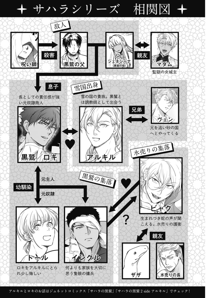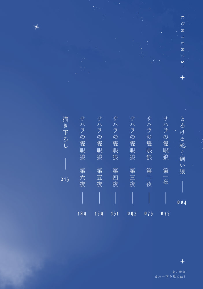 ここはとある砂の国。元主人と元奴○という複雑な関係をもちながらも、幼馴染として、家族としてお互いを大切に想い合っているロキ、トール、イングルの3人。しかし、イングルに恋するビャクにとっては、その強固な3人の関係性がとにかく気にくわない。なんとかして自分に気を向けて欲しいと思いながらも素直になれないビャクだったが、とある事情によりイングルと共犯関係を組むことになりーーーこれは恋を知らない狼と、そんな彼に一生に一度の片想いをした蛇の物語。