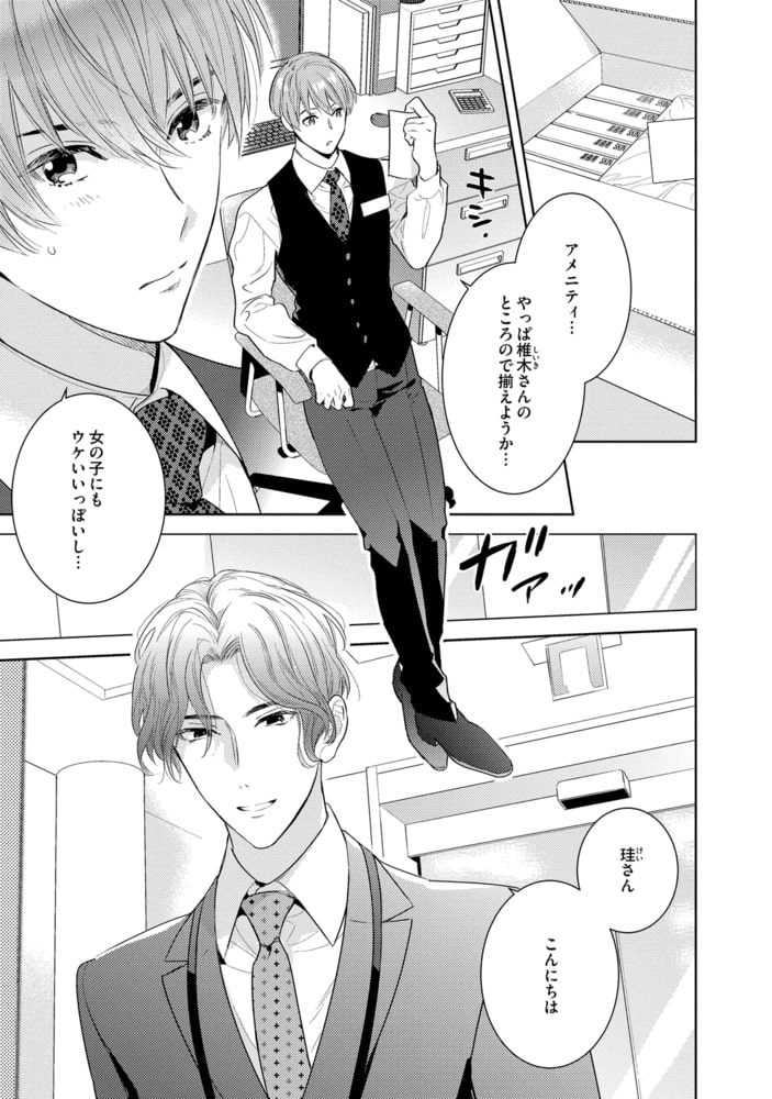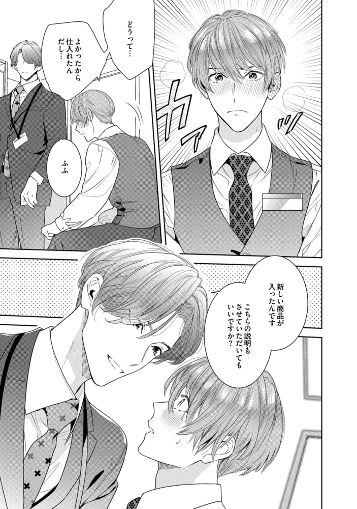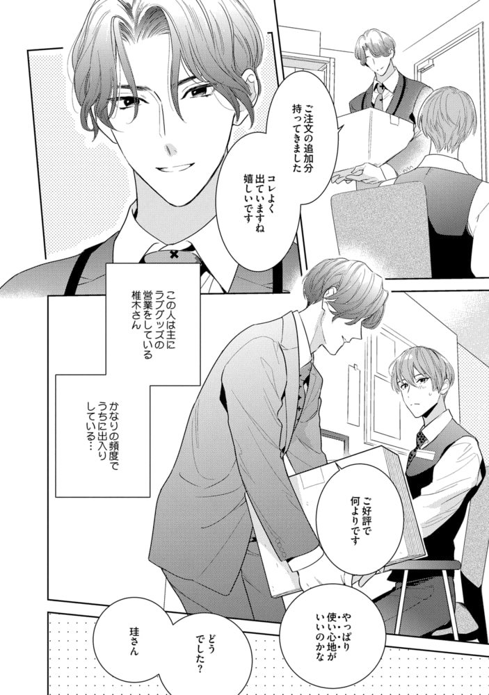 ラブホテルを経営する珪は、ホテルに置くアダルトグッズを取引先の椎木と試す仲だ。椎木の甘い顔で頼まれると断れず、ついつい何度も際どい行為をしてしまう…。そんなある日、新商品のコンドームの使い心地を試すため、椎木のアレを挿入してもらうことになったけど!?
