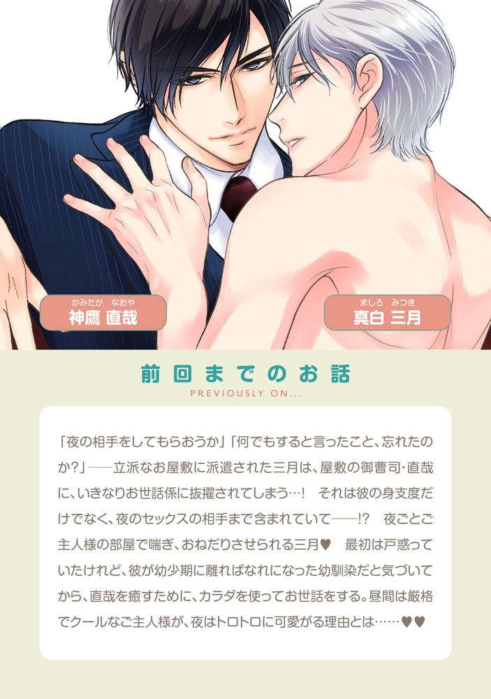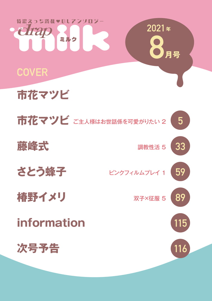 人気連載&新作! 藤峰式「調教性活」最新作を掲載!! ほか、ポリネシアンSEX★AV撮影★W攻×受3Pとオール描き下ろしマンガで読みごたえ大満足!! 市花マツビ「ご主人様はお世話係を可愛がりたい2」屋敷の御曹司・直哉に、いきなりお世話係に抜擢されてしまった三月。それに夜のセックスの相手まで含まれていて──!? 昼間は厳格でクールなご主人様が、夜はトロトロにエロ可愛がるギャップに、ドキドキする三月は──。 藤峰式「調教性活5」超人気!!「調教」シリーズ・連載中!!藤田、ポリネシアンセックスに挑戦します! 鬼上司・金岡に褒められると勃起してしまう体質になってしまった藤田。金岡と恋人同士になり、恋も仕事も順風満帆! そんなある日、金岡の提案で「ポリネシアンセックス」にチャレンジすることに。甘やかされてつらい日が来るなんて!?!? さとう蜂子「ピンクフィルムプレイ1」待望の新連載★スタート!!「俺の顔ばっか撮ってんなよ。ちゃんとアンタが咥えてる所、見せてやれ」人気タチ専モデル・新庄が出演するAVは全てバカ売れ。そんな新庄が主演の撮影で、急遽相手役が不在になり「俺はアンタがいい」と、新庄がAV監督の奥村を逆指名!! ハメ撮りならぬ、ハメられ撮りすることに……★ 椿野イメリ「双子×征服 5」堂坂一族のはみ出し者・ルミは、父親が借金で高飛びし、一夜にして富豪から一文無しに落ちてしまう。そんなルミの前に「体で払え」と傲慢なイケメン双子が現れ、カラダを差し出すハメに!! エロエロに開発されて、快楽を覚えてしまう★ ところが、モブ男にルミが攫われてしまい──? 今月号は、市花マツビ先生「ご主人様はお世話係を可愛がりたい」より、ご主人様・直哉とお世話係・三月の美麗表紙が目印です★