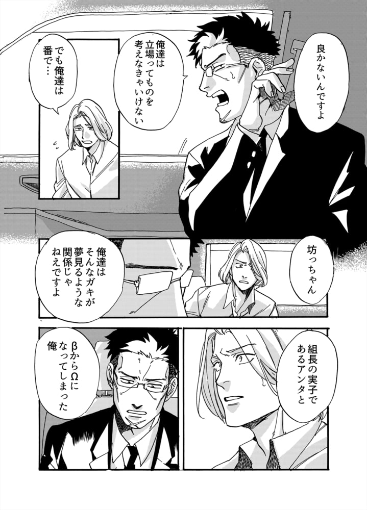 「ガチで孕ませるから、覚悟して」αで構成された組の中で、唯一のβながら幹部にのし上がった佐山。組長の次男坊・涼の世話係も任されるなど一目を置かれていた。そんなある日、シマを荒らしていた輩と揉み合った際に妙な薬品を掛けられてしまう。ただの媚薬だと思っていたのに…気づけば身体がΩに変わっていて!?燃えるように身体は火照り、溢れ出るフェロモン。そんな異変に気付いた涼に触れられると本能が彼を欲しがって後ろが疼く…。ダメだと頭では分かっているのにグズグズに抱き潰され、さらに強引にうなじを噛まれ番にされてしまい―…年下α×堅物ヤクザ、本能をこじ開けられた極道オメガバース。