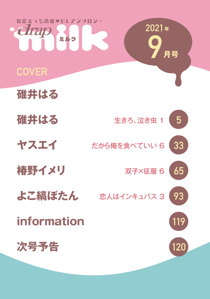 泣き虫攻★同棲ラブエロ★淫魔★征服3P drapmilkはオール描き下ろしマンガで読みごたえ大満足!! 碓井はる「生きろ、泣き虫 1」一生、言うつもりなんてなかったのに──。 23歳の夏、余命を宣告されたジュンタは、ずっと想いを寄せていたマナトに勢いで大告白をしてしまう。冗談にして忘れてもらうつもりが、マナトから「お前はどうしたい」と問われ……!? 注目の新連載スタート!! ヤスエイ「だから俺を食べていい 6」天才肌の芸術家・高坂と、公務員の修司は幼馴染み。修司が毎朝スープを届けると、高坂は「俺を食べていいぞ」と嬉しそうに豪語する。そんな彼に抱かれることを夢想し、自慰を繰り返してしまう修司。ヌき合いの関係になってからも片想いをこじらせていたが、ついに相思相愛に!ラブエロな最終話★ よこ縞ぼたん「恋人はインキュバス 3」『もう他の精液じゃ満足できないようにしてやる』──インキュバスが珍しくない世界。精液不足でヘロヘロだったインキュバスの瑞希は、精液が濃そうな真面目くんを発見! 「絶対ヤる!」と狙いを決めて精液をたっぷり搾りとっちゃう☆ けど、真面目な彼は他の男の精液摂取は許せなくて!? 椿野イメリ「双子×征服 6」堂坂一族のはみ出し者・ルミは、父親が借金で高飛びし、一夜にして富豪から一文無しに落ちてしまう。そんなルミの前に「体で払え」と傲慢なイケメン双子が現れ、カラダを差し出すハメに!! エロエロに開発されて、快楽を覚えてしまう★ そんな超攻め双子との結末はどうなる!? ハッピーエンド保証★の最終話! 今月号は、碓井はる先生「生きろ、泣き虫 」より、マナト&ジュンタの表紙が目印です★