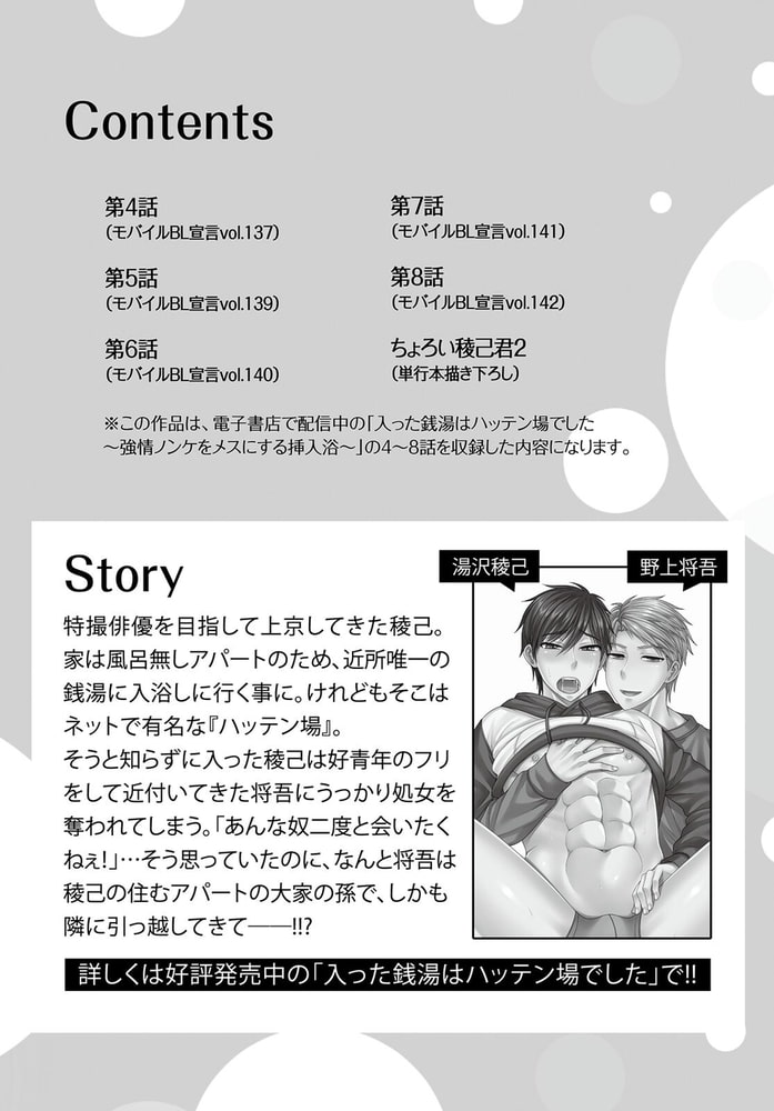 【電子書店限定、イラスト1P収録】【こちらは話売り『入った銭湯はハッテン場でした~強情ノンケをメスにする挿入浴~』4~8話を収録した単行本の電子版になります。】うっかり迷いこんだハッテン場銭湯で、将吾に文字通りハメられてしまった稜己。しかもその因縁の相手・将吾が隣の部屋に引っ越してきて超最悪!!――と思いきやツテから特撮の仕事を紹介して貰え、一応夢には近づいた…?一方で気になるのは銭湯問題。「絶対に俺と一緒に来て」将吾からは二人で入りに行くよう言われていたけど、ハッテン場のルールを知ったから大丈夫と高を括った稜己が一人で銭湯に向かうと…?ノンケ狙いの客に囲まれ大ピンチ!!? 『入った銭湯はハッテン場でした』の第2巻!
