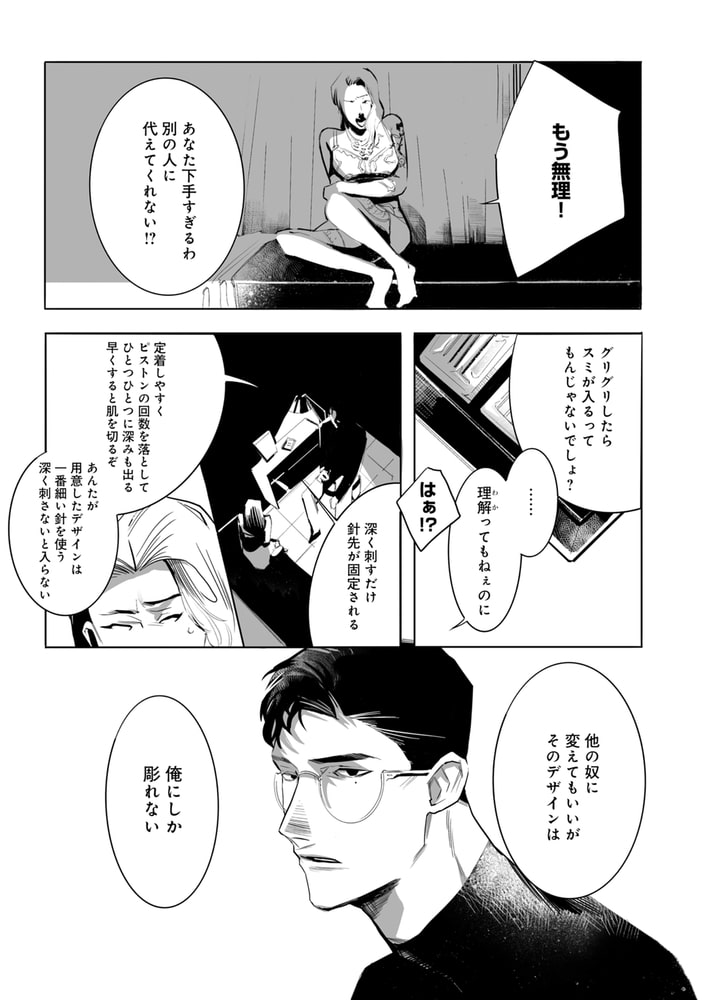 タトゥーアーティストのコーキはデザインと彫る技術においては優秀だったが、人に興味がなく性格に難があるため、依頼のキャンセルがあとを絶たなかった。