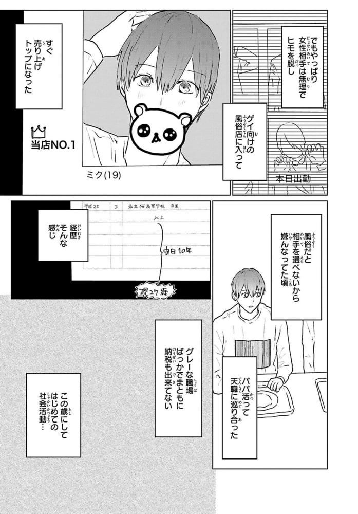 金のため、金のため、すべては金のため――!!ちょろいお金持ち相手にパパ活で生計をたてている未来。これが天職だと思っていたある日、新しいパパとして待ち合わせ場所にやってきたのは、かつて自分をよく見つめていた変わり者の元同級生・沼田だった。さすがに知り合いは…とためらうも、こいつをパパとして育てた方が稼げると思い直しホテルへ直行!大きい体、熱い体温、見たことないほど大きい……アソコ!?今まで相手にしてきたパパたちと違って、若く情熱的な男に主導権を握られてしまい!?なんで俺がイかされてるんだ!!お前が俺に狂えっ…て思うのに、指とアソコで敏感なところを刺激されこっちの方が狂ってしまいそう――!?
