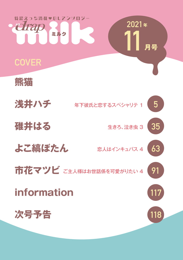 フェライキ★マーキング★インキュバス★お風呂でエッチ! オール描き下ろしマンガで、ラブエロエッチ★読みごたえ大満足!! 浅井ハチ「年下彼氏と恋するスペシャリテ」──「敬を気持ちよくさせられたら、触ってもいいとこ増やしてもいい?」 ──「セックスは、ハタチになってから!!!」 年下の優貴から「海外デビューできたら付き合って欲しい」と、幼い頃に約束した敬。成長したら諦めると思っていたのに、優貴は俳優として海外ドラマで大成功! さっそく、敬をニューヨークへ連れていき!!? デートを重ねていくうちに、キスだけじゃなくフェラでイくことまで覚えて…★ 碓井はる「生きろ、泣き虫 3」一生、言うつもりなんてなかったのに──。 「マナトくんの恋人になれたってだけで、今めちゃくちゃ幸せなんだ」 23歳の夏、余命を宣告されたジュンタは、ずっと想いを寄せていたマナトに勢いで大告白をしてしまう。デートをしながら清い関係でいたけど「恋人なんだからキスくらいするだろ、そんなに気持ちよかったか?」と、マナトから誘われてアソコをヌキ合い、さらに精液でマーキングしてしまい…? よこ縞ぼたん「恋人はインキュバス 4」『最高……!だけど全然足りない、もっとちょうだい★』──インキュバスが珍しくない世界。精液不足でヘロヘロだったインキュバスの瑞希は、精液が濃そうな真面目くんを発見! 「絶対ヤる!」と狙いを決めて精液をたっぷり搾りとっちゃう☆ まことが好きで精液が欲しくてたまらない瑞希は…ラブラブ絶好調! 市花マツビ「ご主人様はお世話係を可愛がりたい4」次期当主で御曹司の直哉に、いきなりお世話係に抜擢されてしまった三月。それは夜のセックスの相手まで含まれていて!? 昼間は厳格でクールなご主人様が、夜はトロトロに可愛がるギャップにドキドキする三月。そんなある日、三月が行方不明に…!? ご褒美はお風呂でドキドキ言葉責めH★ 今月号は、熊猫先生のトロエロえっちな表紙が目印★
