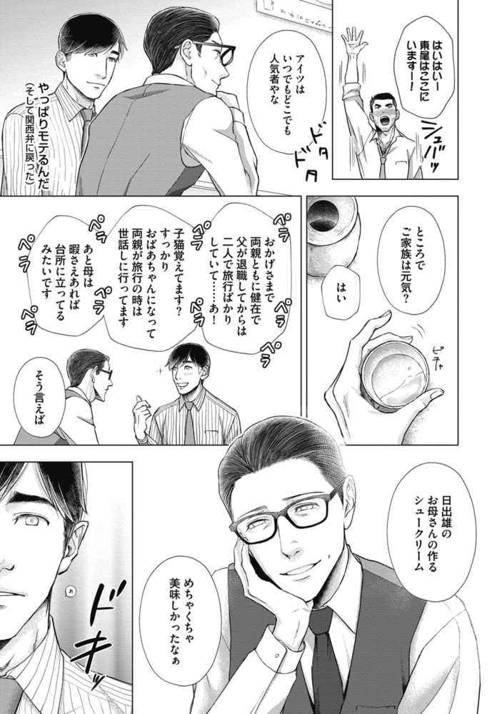 15年後、日出雄はヘッドハンティングされた建築会社の歓迎会で、家庭教師だった上山恭平と運命的な再会を果たす。日出雄は興奮のあまり自慰欲に耐えきれず、歓迎会の途中にトイレで自撮りオナニーをしていたところ、上山が…! 体毛初心者大歓迎〜♥ 上山課長のお墨付き「毛ぇふわふわで気持ち良さそうやな」な初恋ロマンス始まります! コミックス版にあたりほぼ全ページ加筆修正。描き下ろしも充実。六又るん♪、初コミックス!