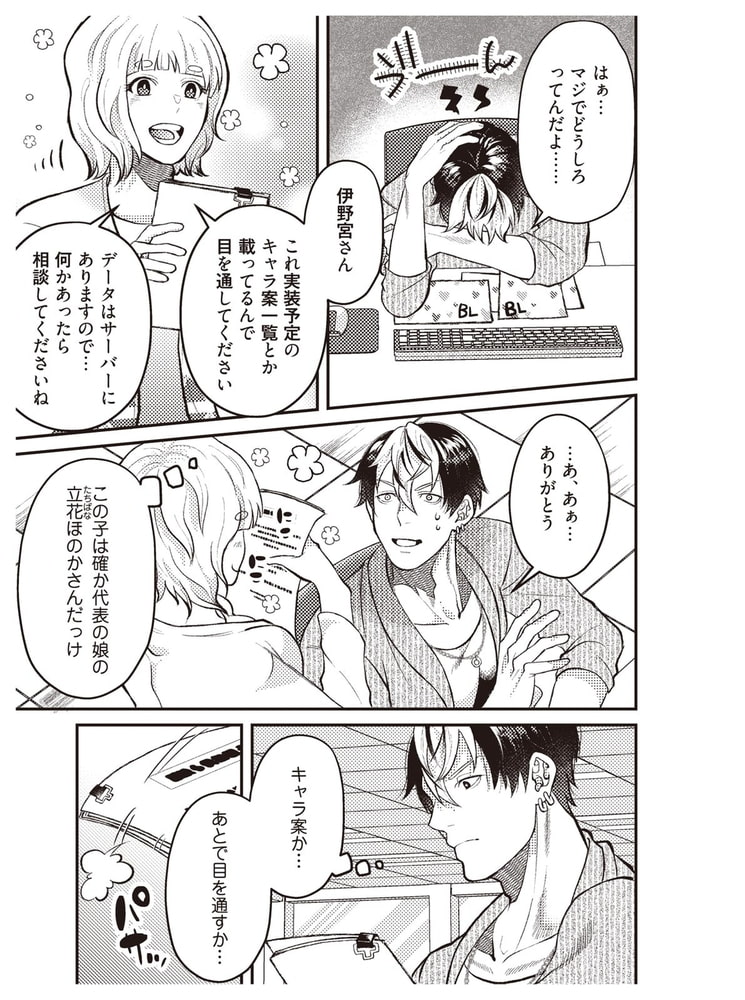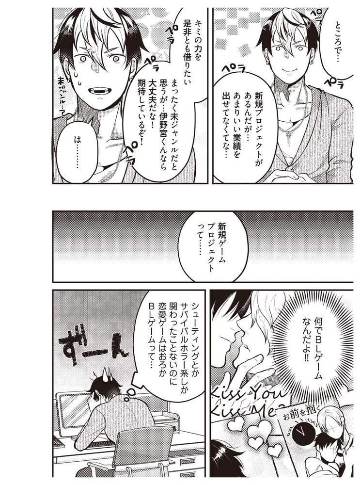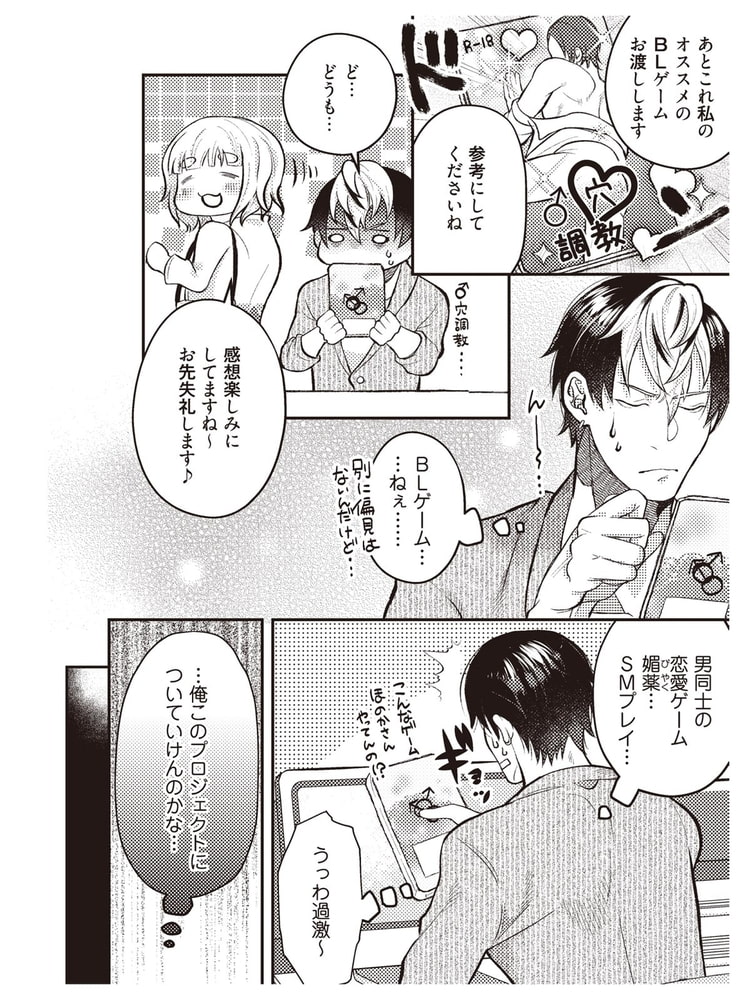 恋愛ゲームにすら携わったことがないのに……。BLという未知のジャンルに戸惑いつつも、社長の期待に応えるべき奮起する隼人。