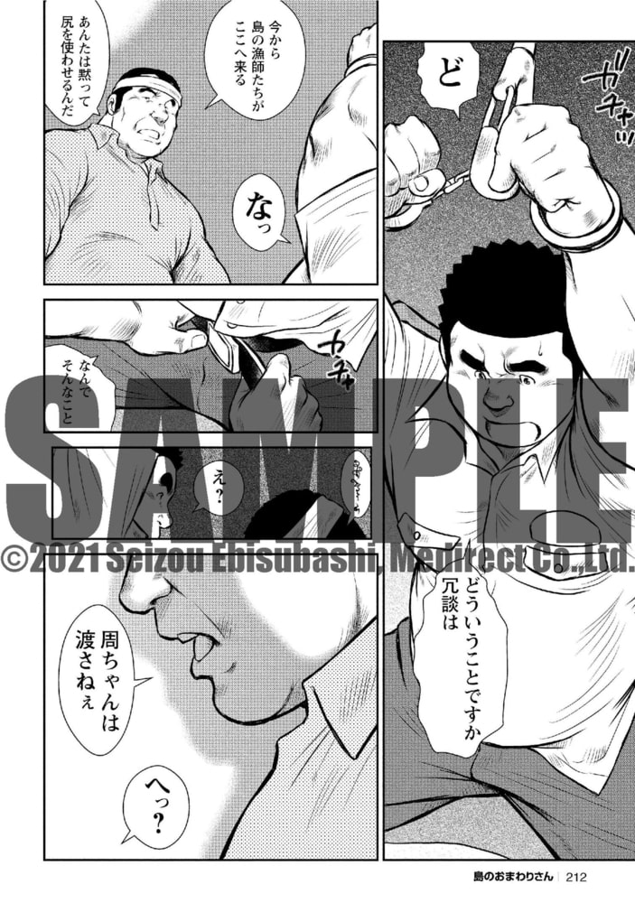 そんな加勢にマッさんが声をかける。漁協の倉庫に連れていかれると、加瀬は手錠で拘束されてしまった。マッさんは「周ちゃんは渡さねぇ」と告げ、男たちに輪○されている加瀬の姿を、周一郎に見せてやるのだと言う。マッさんは祭りの最中、加瀬が周一郎とサカッている場面を目撃し、嫉妬の炎を燃やしていたのだ。